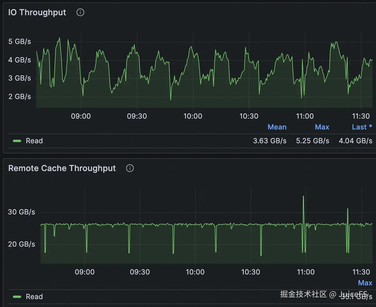 从下图监控数据可见,用户侧接收到的读带宽仅在 3–5 GB/s 区间波动,而后端 Remote Cache 的吞吐能力稳定维持在 25 GB/s 左右,且带宽曲线平稳,表明后端资源已逼近性能上限。二者之间的差距主要源于 JuiceFS 的 readahead 策略 —— 系统预读取的数据远超用户实际所需,导致读放大严重,带宽浪费严重。这意味着为了满足当前的读取需求,系统不得不付出数倍的额外成本。