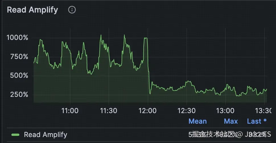 下图展示了优化前后的系统读放大变化。优化前,读放大率一度高达 1042%,意味着系统为了读取实际所需数据付出了 10 倍以上的 IO 成本。优化之后,读放大显著下降,长期稳定在 300% 左右,系统读取效率和带宽利用率均得到显著提升。