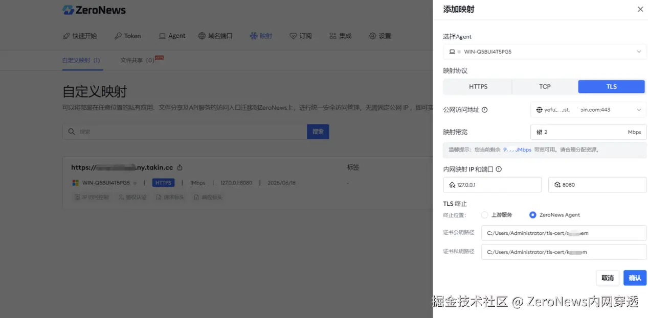 - 选择公网访问的域名:绑定HTTPS:443端口的域名,自定义传输带宽上限,精准控制资源占用;