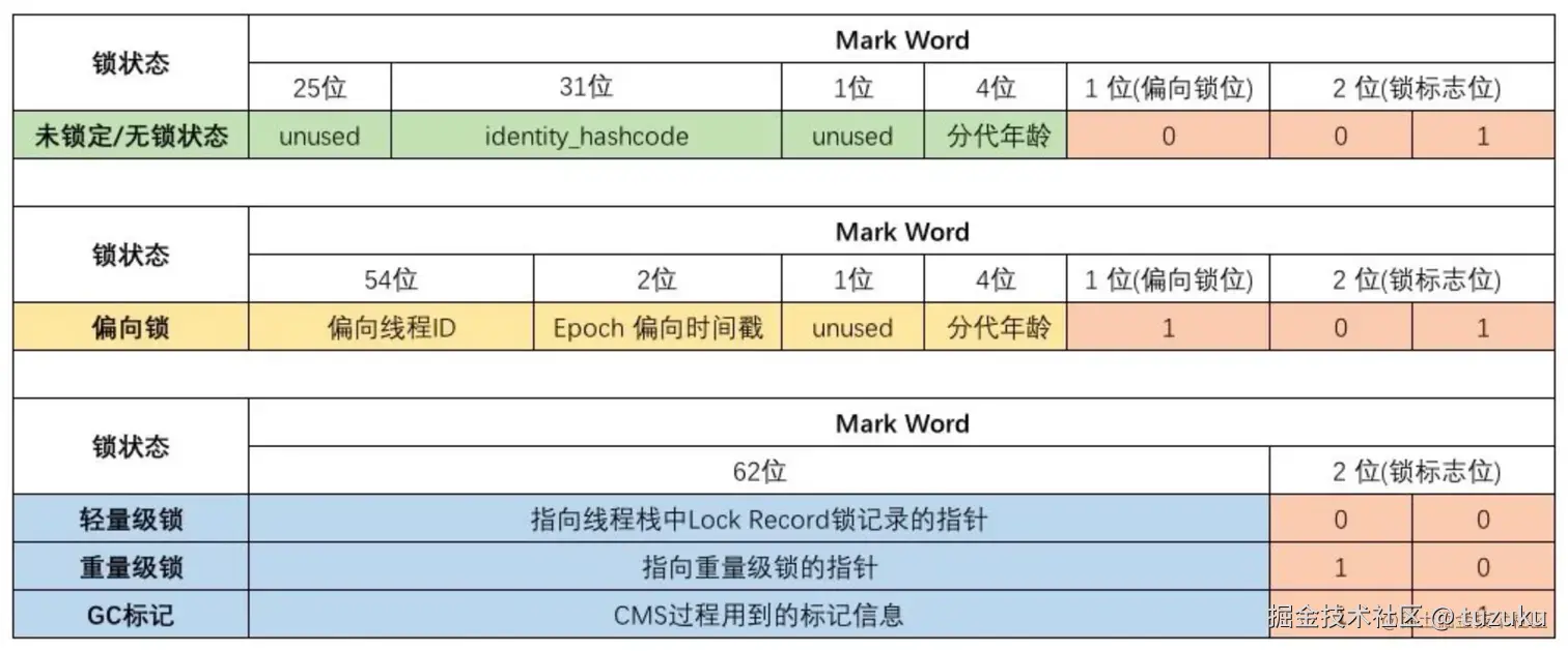 - 无锁时 存储hashcode + 锁标记