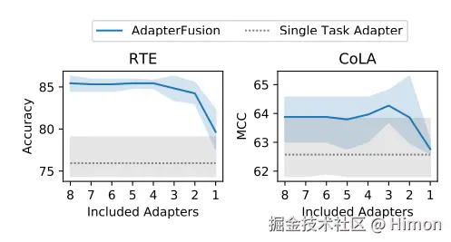 上面实验表明,可以移除 AdapterFusion 中的大多数Adapter而不影响任务性能。使用剩余的两个Adapter,实现了与具有八个Adapter的完整 AdapterFusion 模型相当的结果,并将推理速度提高了 68%。