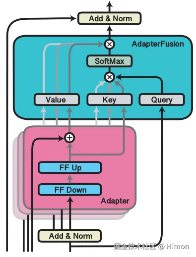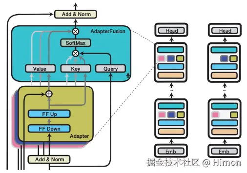 AdapterFusion的结构就是一个attention,他的参数包括query,key和value矩阵参数。在transformer的每一层都存在。他的query就是transformer每一层的输出结果,key和value是N的任务Adapter的输出。通过AdapterFusion层,模型可以为不同任务对应的Adapter分配不同的权重,聚合N个任务的信息。