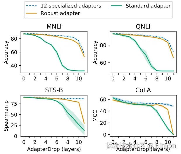 上面实验表明,从较低的 Transformer 层中删除Adapter可以显著提高多任务设置中的推理速度。 例如,将前五个Transformer层中的Adapter丢弃,在对 8 个任务进行推理时,速度提高了 39%。并且即使有多个丢弃层,AdapterDrop 也能保持良好的结果。