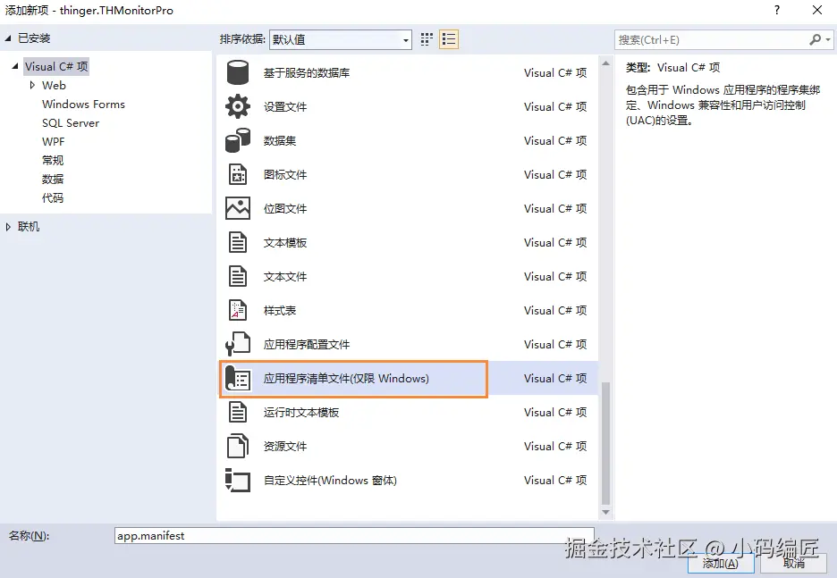 3、找到并添加应用程序清单文件(通常为 app.manifest)。