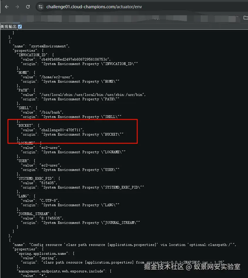 首先我们分析一下,flag 肯定是在存储桶中,因为这里说了已经对我们的桶进行了限制,所以匿名访问的方法可能没有作用,不过这里还是尝试一下,首先匿名访问需要获取存储桶的名称,因为题目已经告诉了 Spring Boot Actuator明显我们可以查看 env