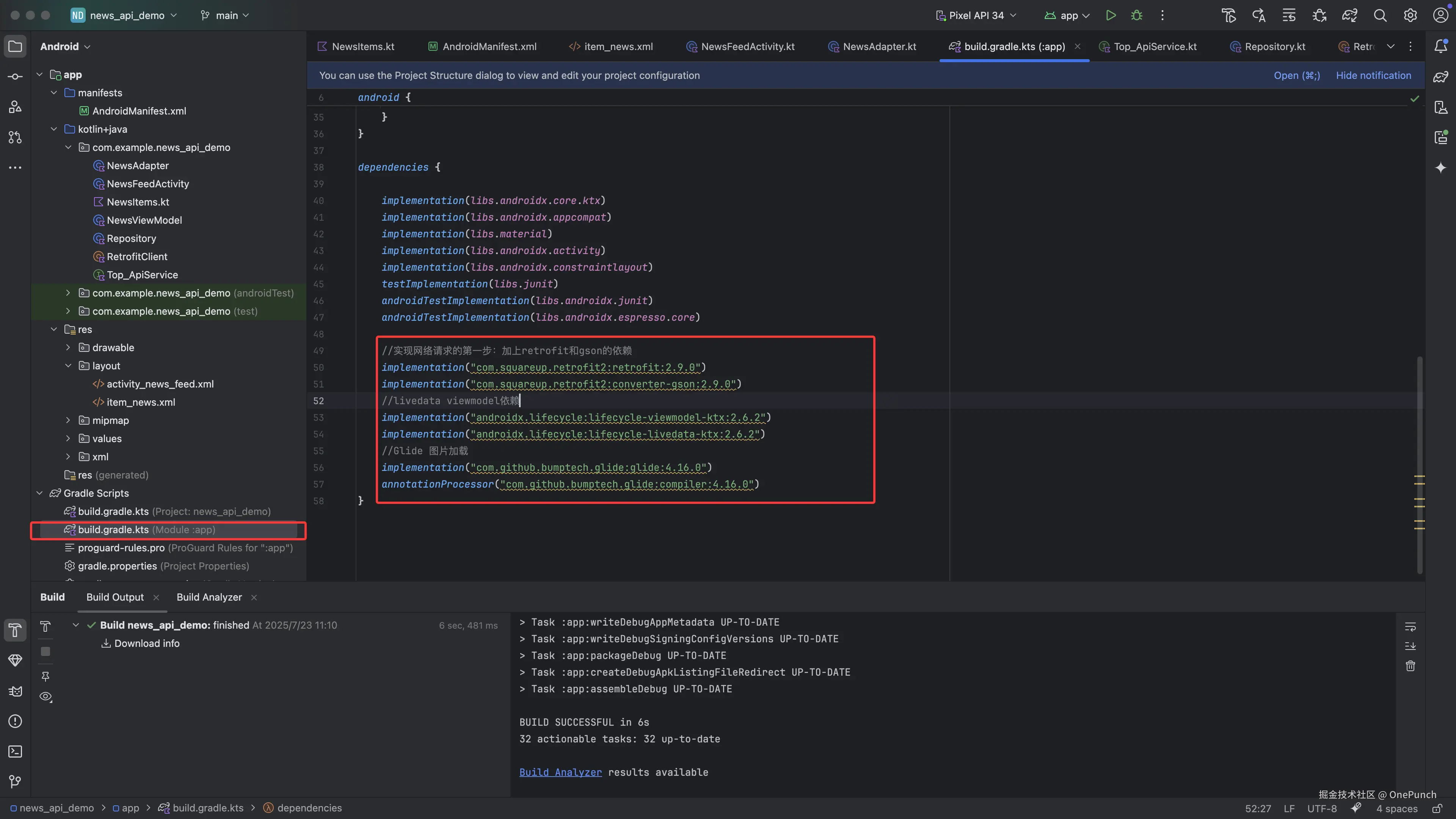在build.gradle中添加Retrofit和Gson等依赖。