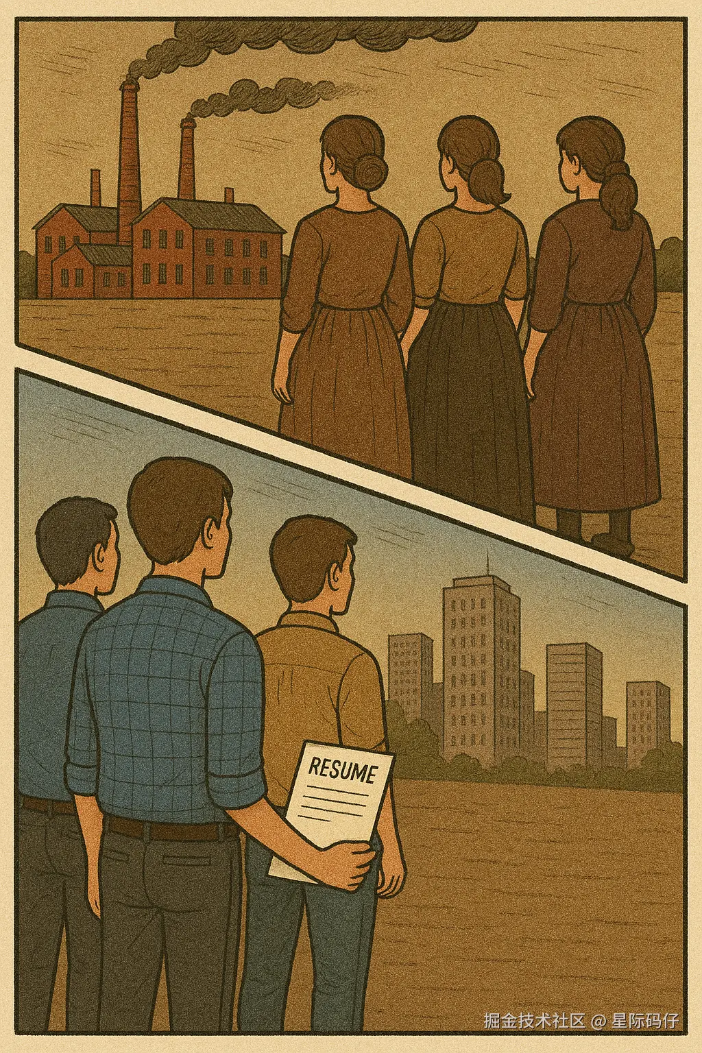 这幅景象,与当年徘徊在曼彻斯特工厂外,不知何去何从的纺织工,何其相似。