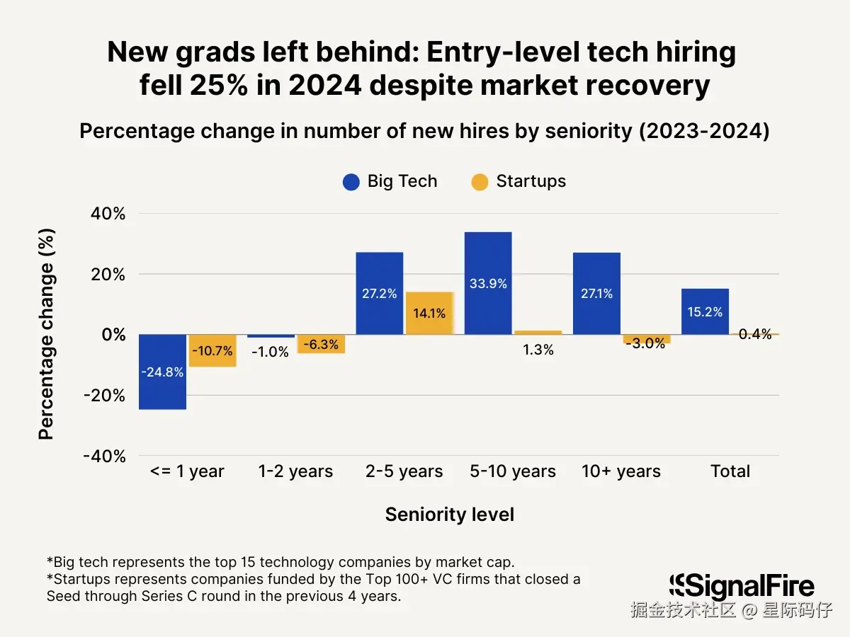 - 风险投资公司 SignalFire 的报告指出,大型科技公司的应届生招聘比例,已从2023年的高点骤降了24.8%,如今仅占总招聘人数的7%。