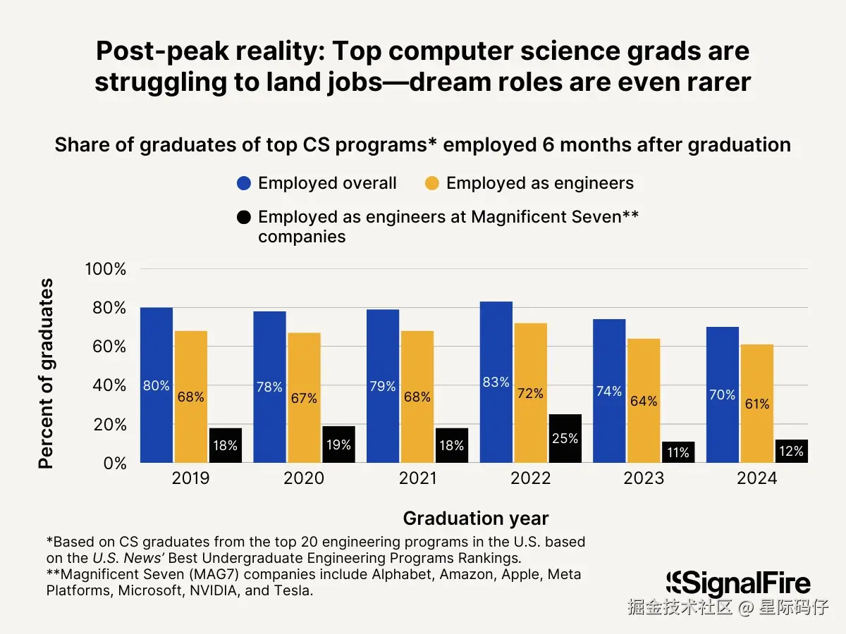 - 该报告的另一份数据显示,自2022年以来,能进入七大科技巨头(Alphabet, Amazon, Apple, Meta, Microsoft, NVIDIA, Tesla)的应届生比例,已经下降了一半以上,从25%降至12%。