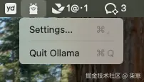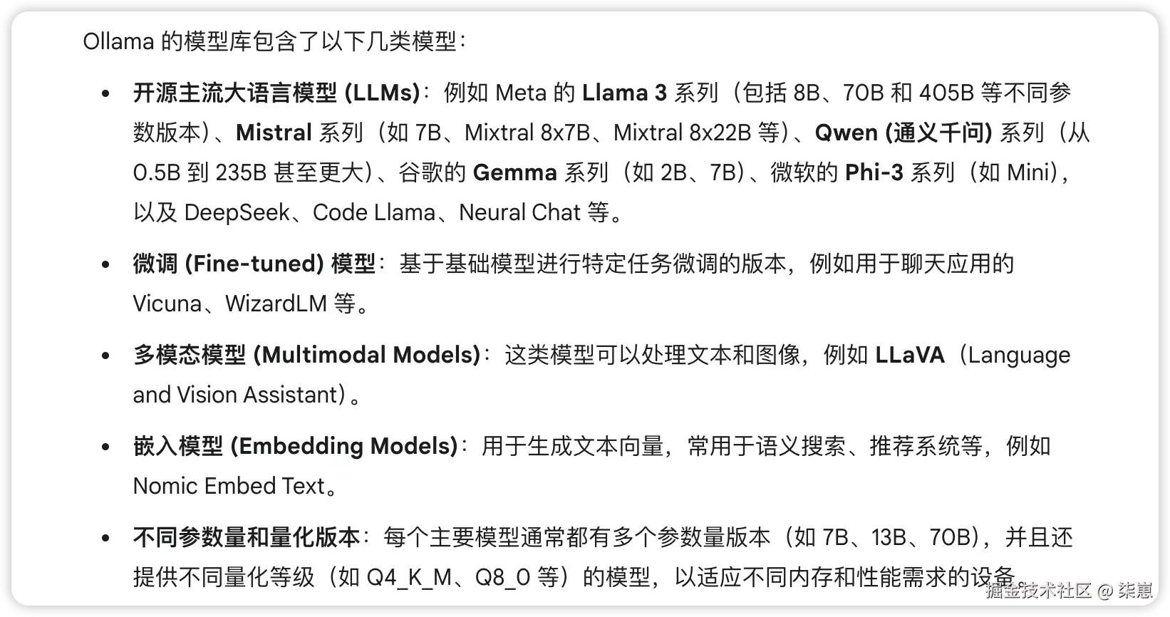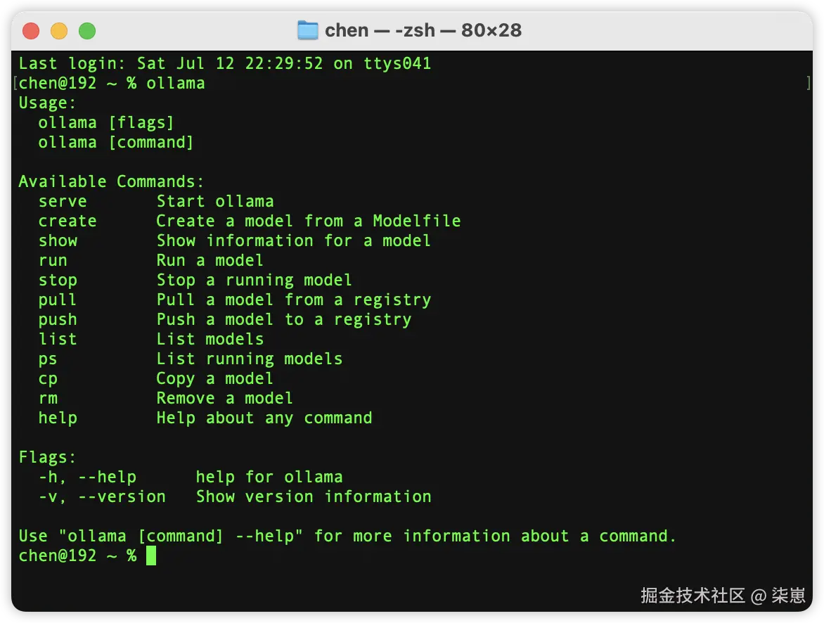 ollama serve:在后台启动 Ollama API 服务(macOS 和 Windows 通常自动运行)。 -