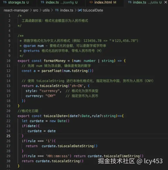 我们总会用到这些的,首先金额我们不希望9999999999999这种,我们希望12,222,333.123,以及日期我们很多时候希望是我们想要的格式,所以我们需要封装。我们从MDN官方文档可以拿到方法,可以直接在utils文件里面创建index.ts封装,
