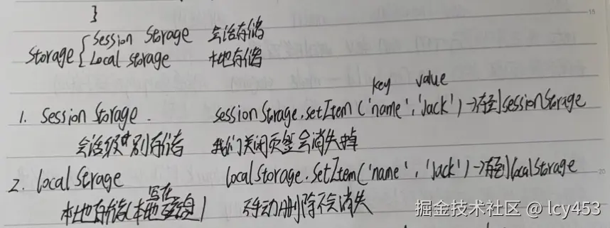 首先storage分为session storage会话存储和local storage本地存储,都是调用setItem(key,value)的方式去存储,然后前者会话级别存储,也就是存到了缓存里面,关闭页面就消失,后者是本地存储,存到了磁盘中 只要不手动删除就不会消失。