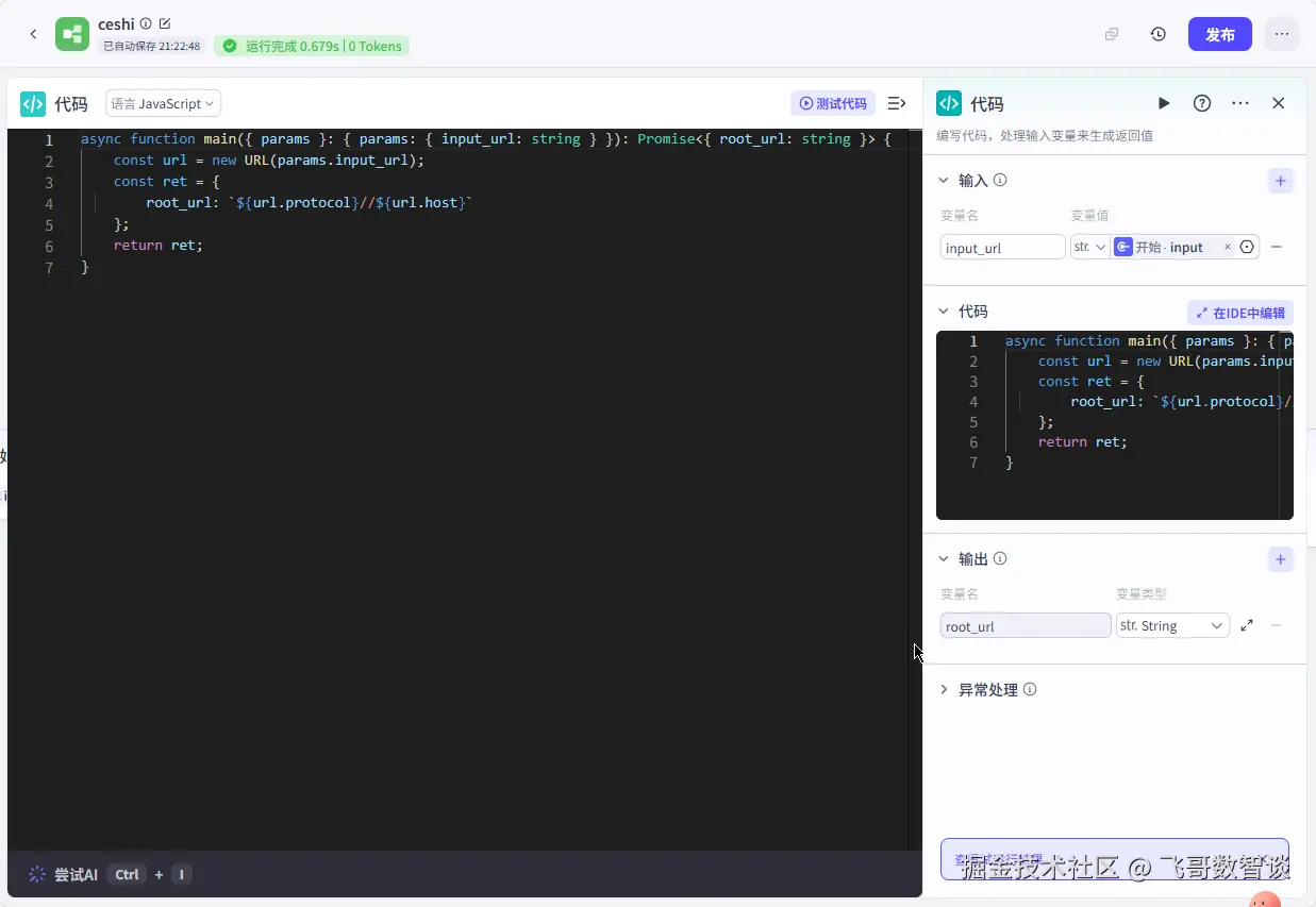 可以看到返回结果包括“输入”、“代码”、“输出”,分别对应 代码 节点的三部分配置。