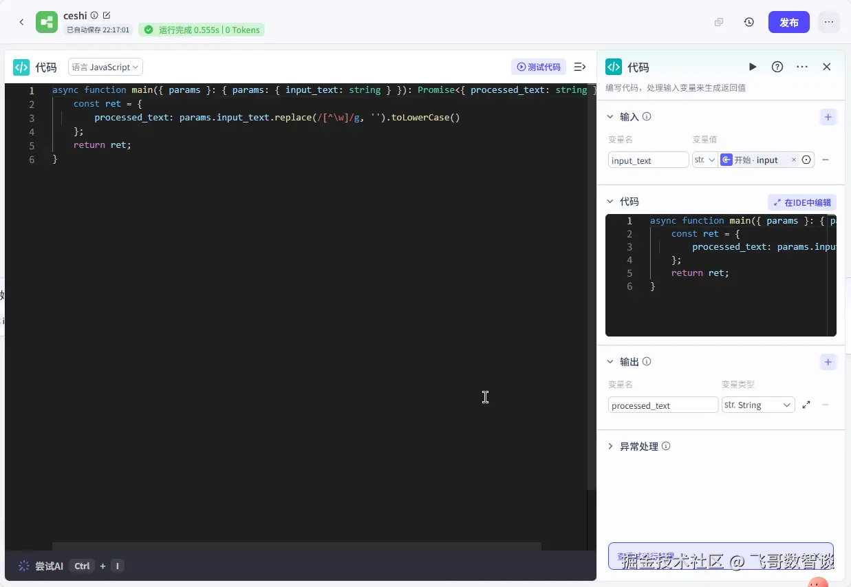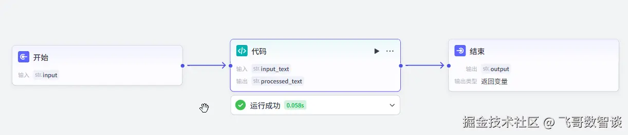 代码节点接收“开始”的输入,“结束”节点负责呈现 代码 节点的输出。