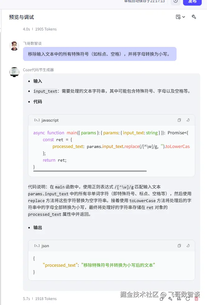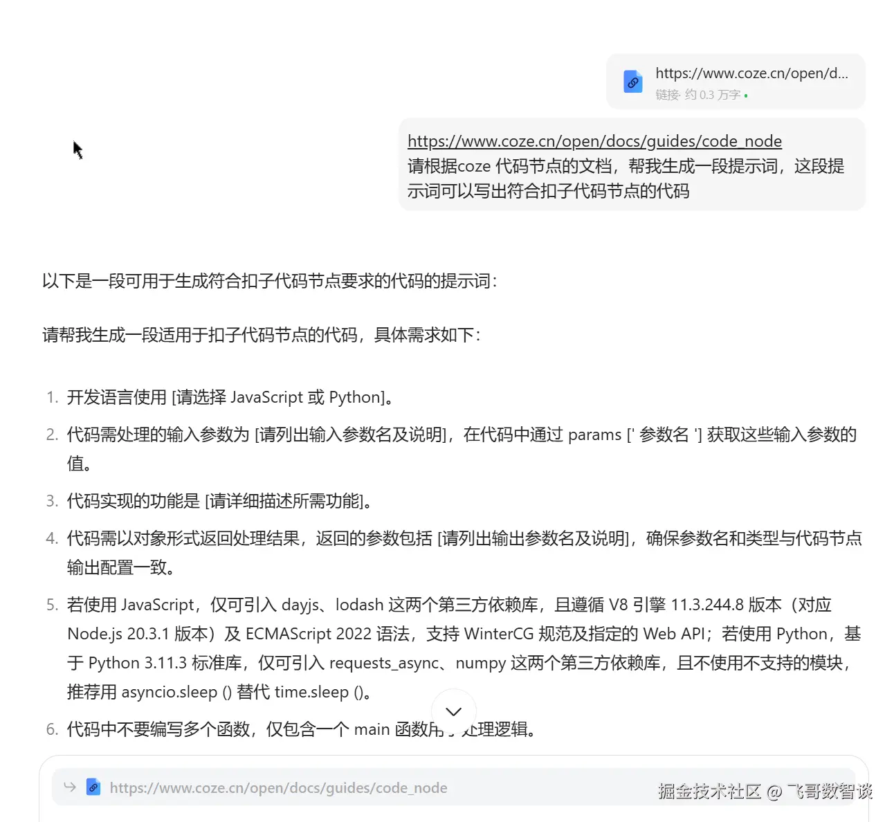 在开发 Coze 工作流的时候,如果遇到需要使用代码节点的时候,直接与它对话,然后根据返回进行配置即可。