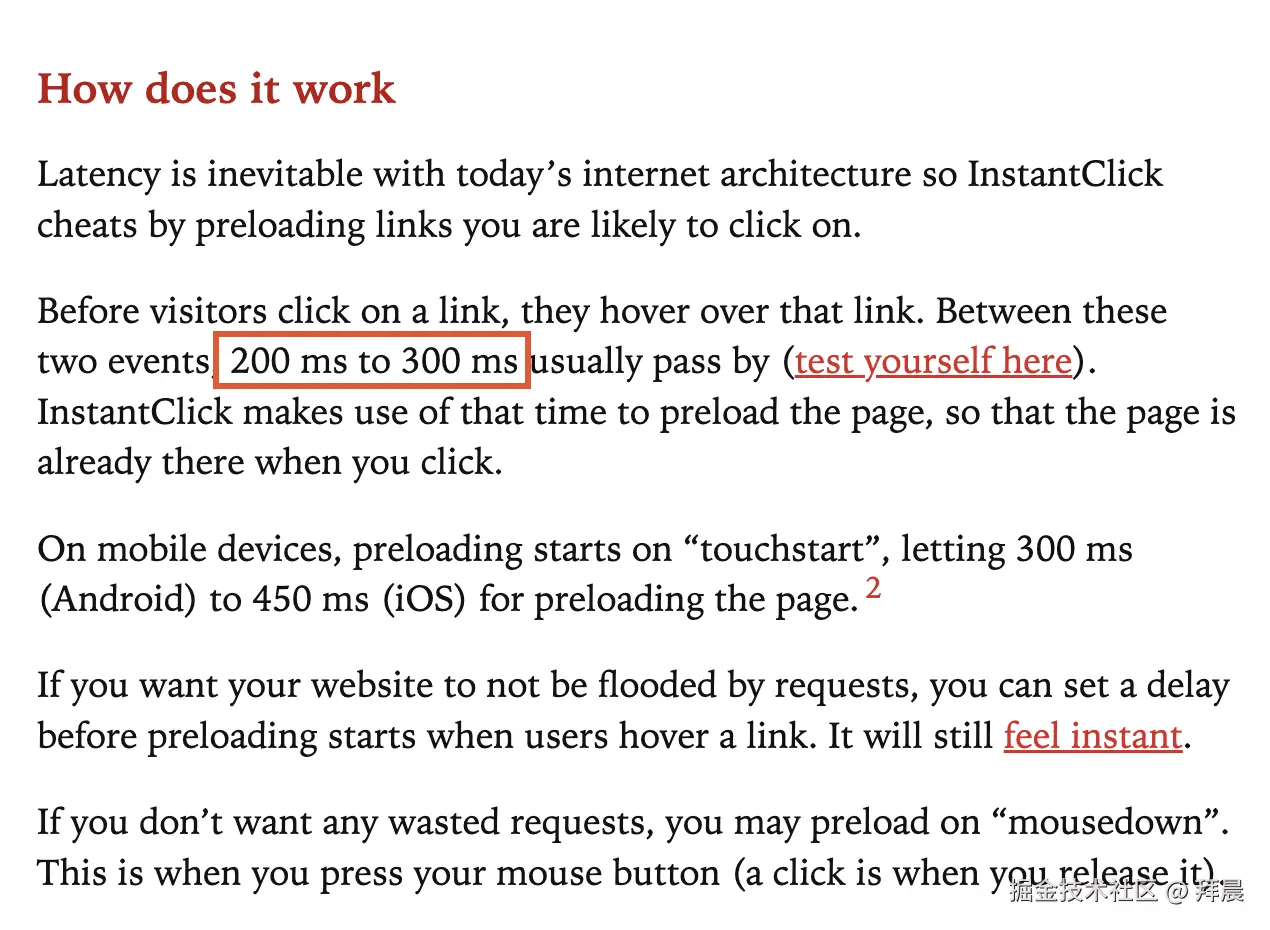 300ms这个阈值参考自一个优秀的开源预加载库 InstantClick的标准