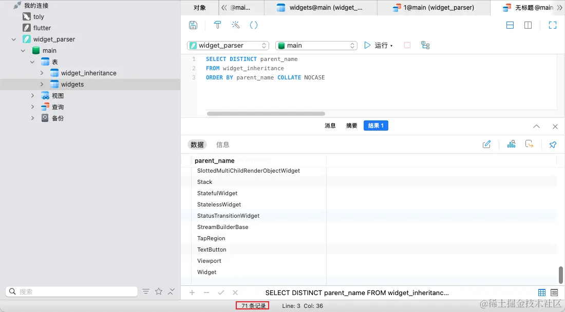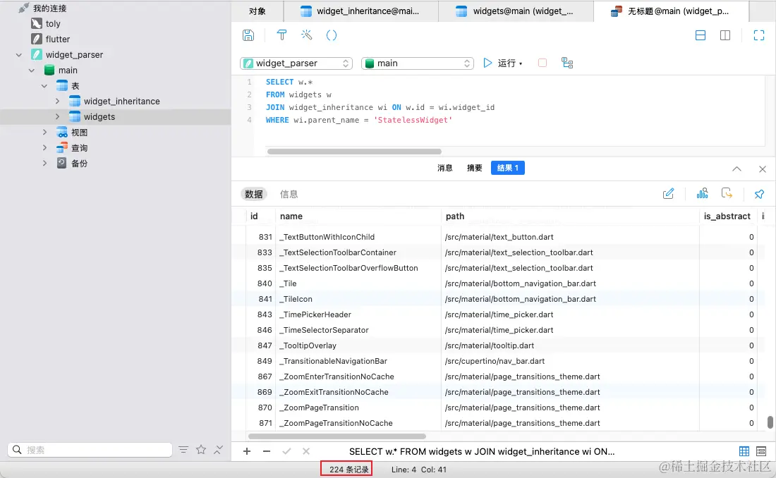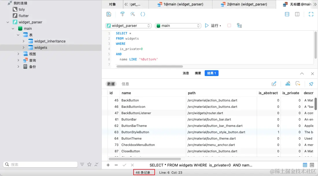 数据库一建好,我们就算是把 Flutter 的组件体系“数字化”存档了。后续还可以继续解析和入库更复杂的结构,比如每个组件类中有哪些字段,字段类型的详细信息等等。甚至你可以分析出 Flutter 组件中有哪些组件有 padding 属性。