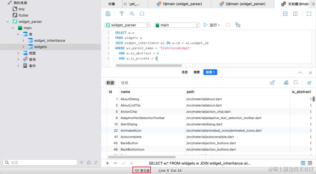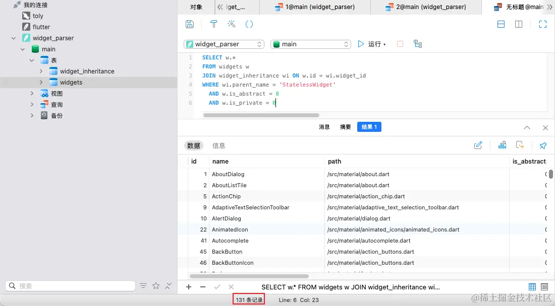这样就可以分析出 Flutter SDK 中公开可用的 StatelessWidget 派生类一共有 131 个: