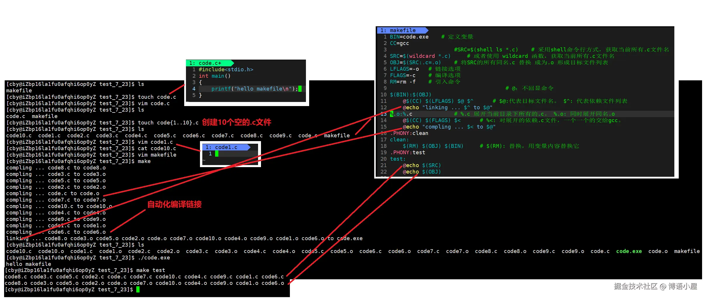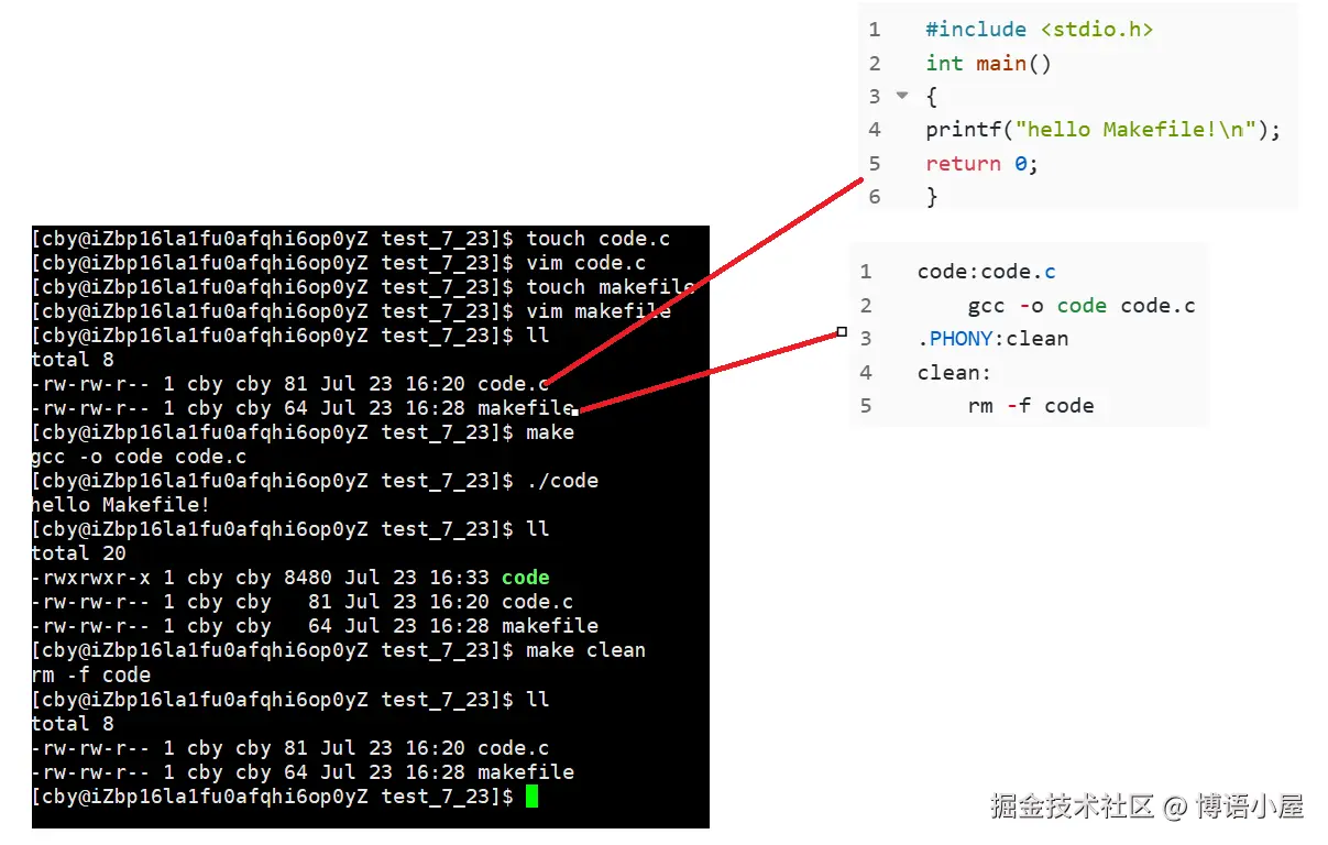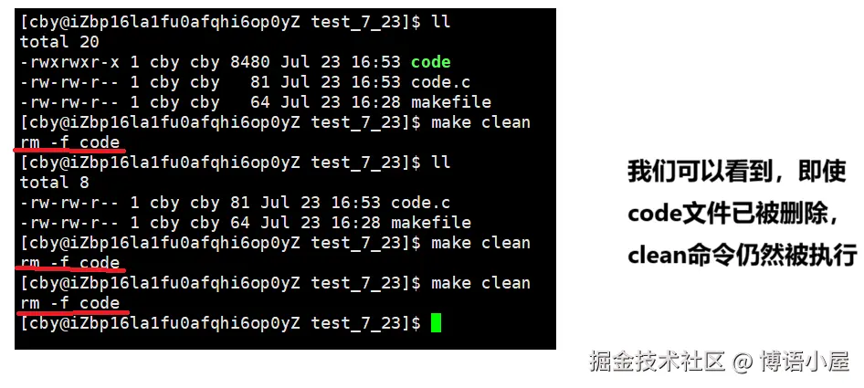 我们可以看到,make后code.c文件自动编译成为code可执行文件,make clean 后code文件被删除