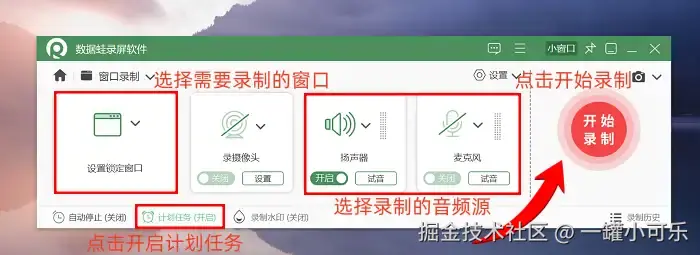步骤2:打开之后,你可以根据自己的需要调整设置。先锁定需要录制的窗口,勾选需要录制的音频源。要是不想一直盯着点开始,还能打开 “计划录制任务” ,设好时间它自己就录了,省事儿。