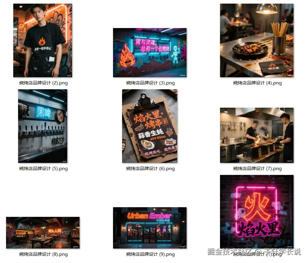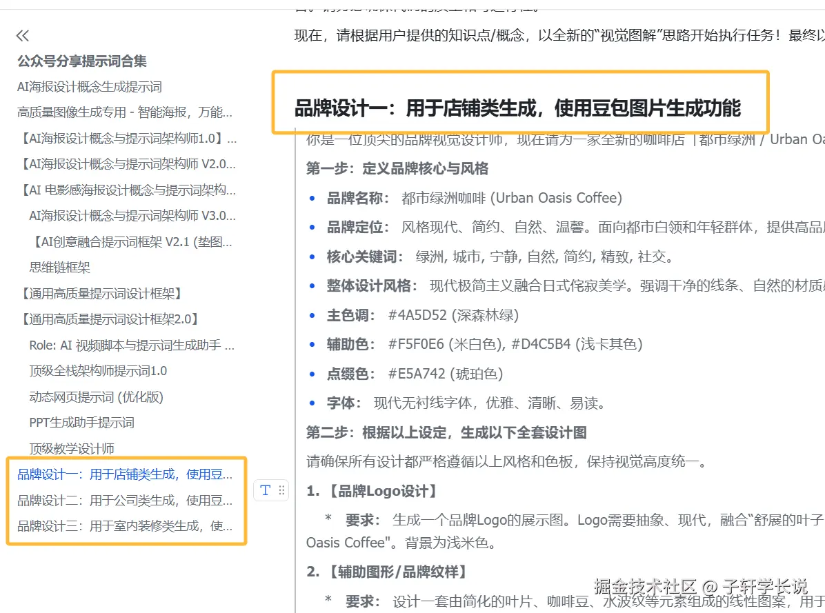 于是我就针对品牌设计常见的设计方向:品牌logo,品牌纹样,店面门头,室内空间,产品设计,员工服装,菜单等等,设计了一套提示词。