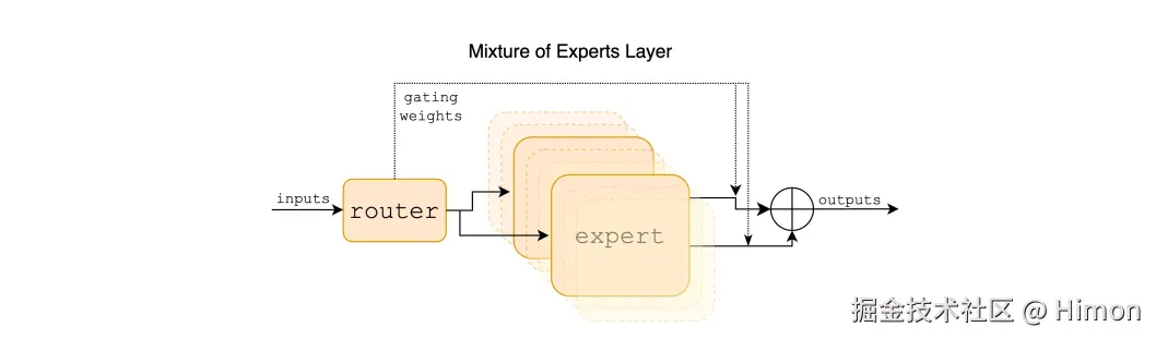 如上图所示,MoE模块的输出是所有专家网络输出的加权和,每个专家网络就是前馈神经网络,权重是由门控网络生成,假设有n个专家网络,其中是门控网络的输出向量(n维的概率向量),是第i个专家网络的输出向量,则MoE的输出可以表示成: