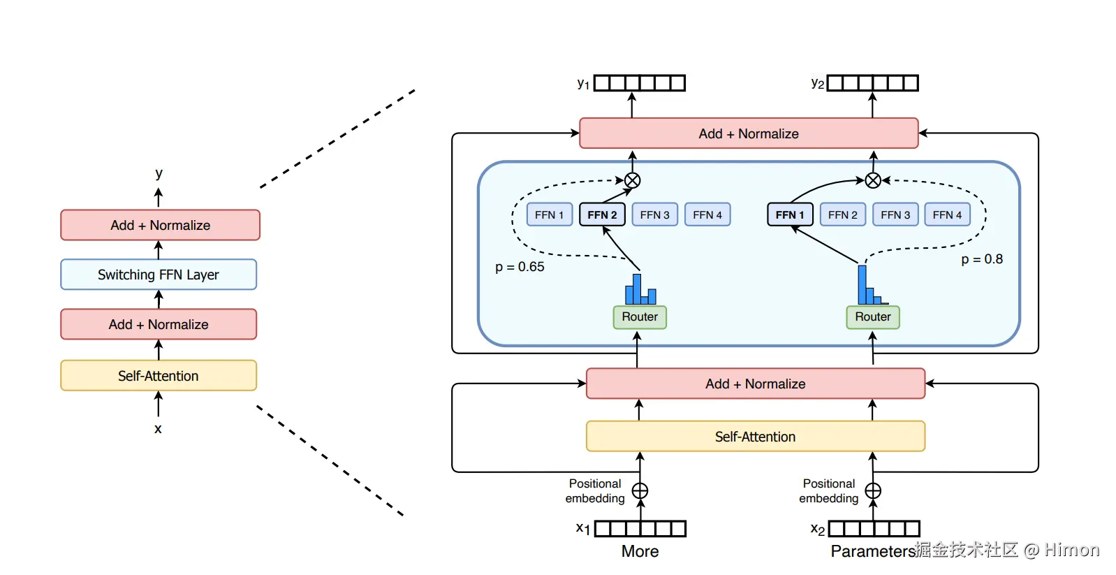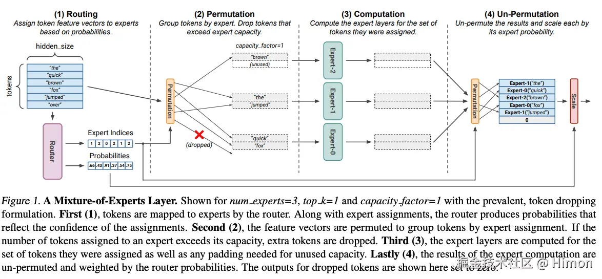 Swith Transformer的MoE设计是门控网络每次只route到1个专家。采用softmax来计算门控网络层的输出。