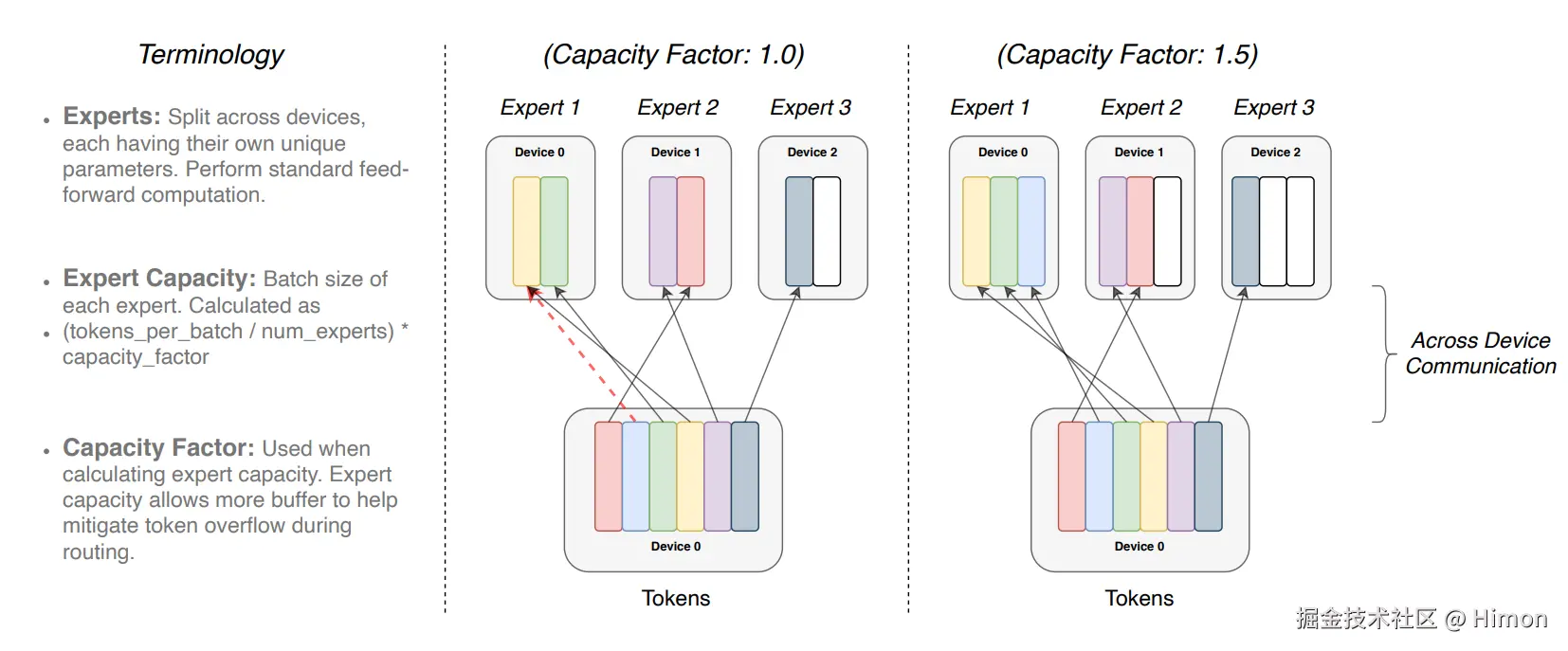 B每个batch中token的数量,N:core的数量,n:数据并行的分区数量,m:模型并行的分区数量,E:专家的数量,C:Expert capacity,每个专家的batch size。