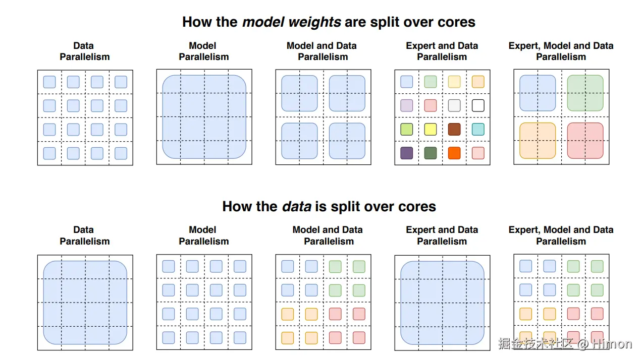 数据并行+模型并行:上图第三列。是数据并行和模型并行的结合。一共有N=n*m个core,每个core负责计算 B/n个tokens以及分配到的的模型权重和中间activation产出。在前向以及后向计算之间时的tensor大小是。这种模式cores被分为4组,每组共享一份全量的模型权重,4组模型权重做数据并行,4组模型组内切分做模型并行。数据切分,不同组模型处理不同的数据(不同颜色区分),在一个组内4个core做模型并行,数据被辅助成多份共用(如图中蓝色被复制成多份)。