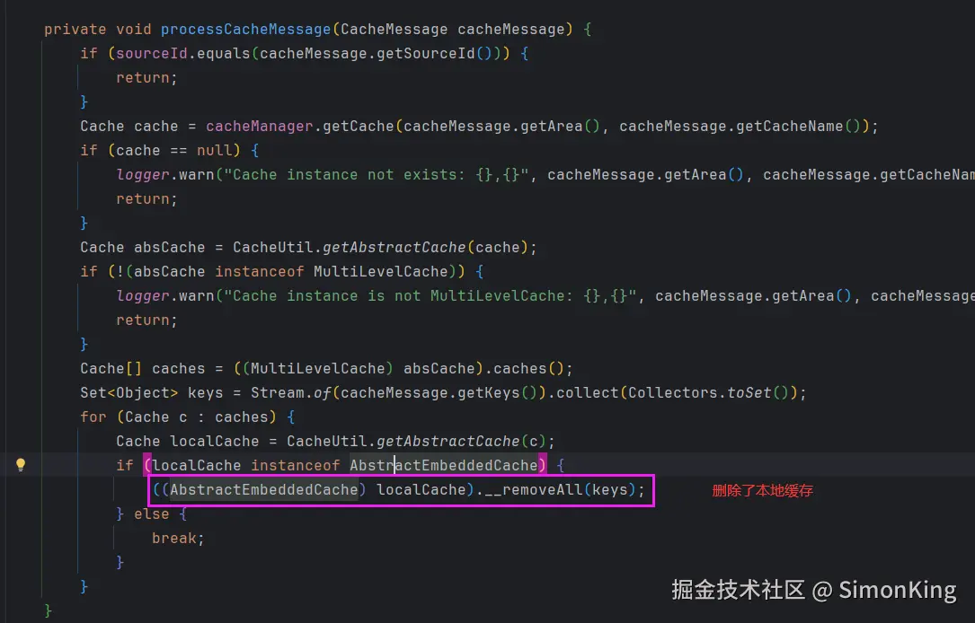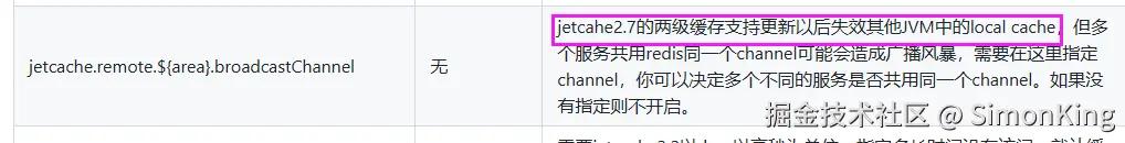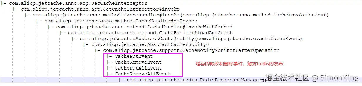 问题终于解决了。从注释里面可以知道是通过BroadcastManager广播实现的,因为我用的是Jedis客户端,所以直接看com.alicp.jetcache.redis.RedisBroadcastManager即可。