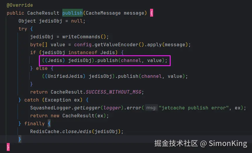 截图上可以看到,直接调用了Jedis客户端的发布的方法。