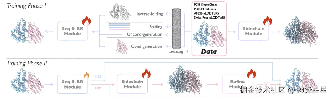 解耦噪声过程: 将序列与结构的噪声过程分离,避免传统方法中模态间依赖关系的破坏。噪声序列与噪声 backbone 的时间步独立采样,确保模型能够学习双向的序列-结构依赖关系。