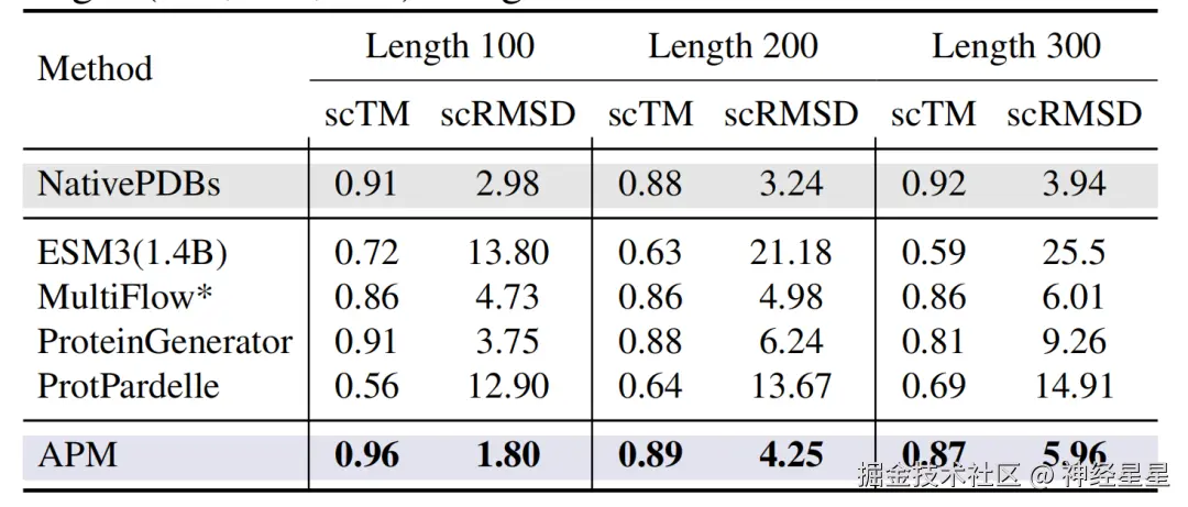 此外,如下图所示,在无条件生成的长度为 100-300 的残基蛋白中,APM 的 scTM 达 0.96(Length 100),scRMSD 低至 1.80, 显著优于 ESM3(1.4B)、 ProtPardelle 等全原子设计模型。