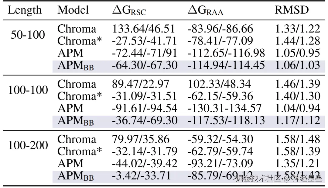 其次,生成的多链复合物具有强结合亲和力, 以 50-100 链长为例,全原子松弛后的结合能 ΔG_RAA 达 -112.65/-116.98,显著优于 Chroma(-83.96/-86.66)和仅用主链的 APM_BB(-114.94/-114.45),证明全原子信息对链间作用建模的必要性。