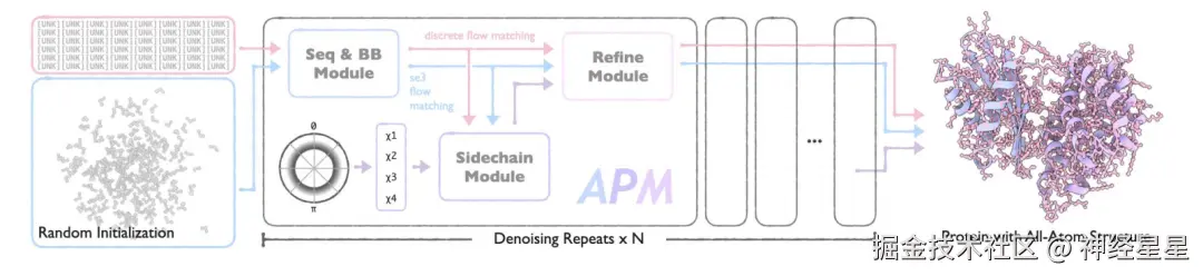 APM 的核心架构由序列与 backbone 生成模块(Seq&BB Module)、侧链生成模块(Sidechain Module)和全原子优化模块(Refine Module)3 个功能明确的模块协同组成, 通过创新的设计实现了从序列到全原子结构的端到端生成,同时支持多链蛋白质的各种设计任务。