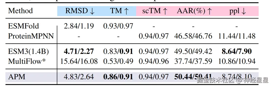 折叠任务中,在 PDB 数据集上,APM 的 RMSD 为 4.83/2.64, TM-score 达 0.86/0.91,与 ESM3 、 MultiFlow 等模型性能相当;逆折叠任务中,氨基酸回收率(AAR)达 50.44%,超越 ProteinMPNN 的 46.58% 。