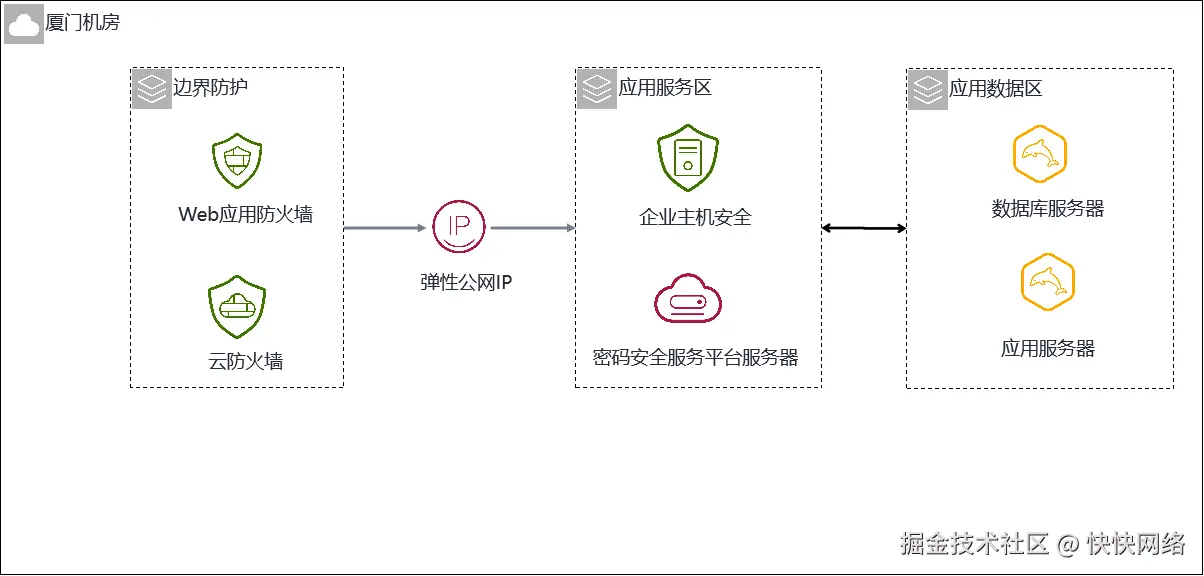 部署自主研发的防火墙保证网络边界安全防护,以及配备主机安全实现对服务器的入侵防范和恶意代码防范,同时部署了数据库服务器、对数据进行存储和管理。