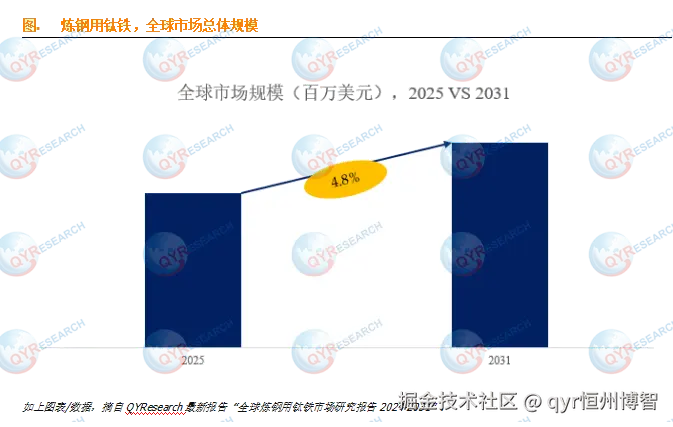 据QYResearch调研团队最新报告“全球炼钢用钛铁市场报告2025-2031”显示,预计2031年全球炼钢用钛铁市场规模将达到3.9亿美元,未来几年年复合增长率CAGR为4.8%。