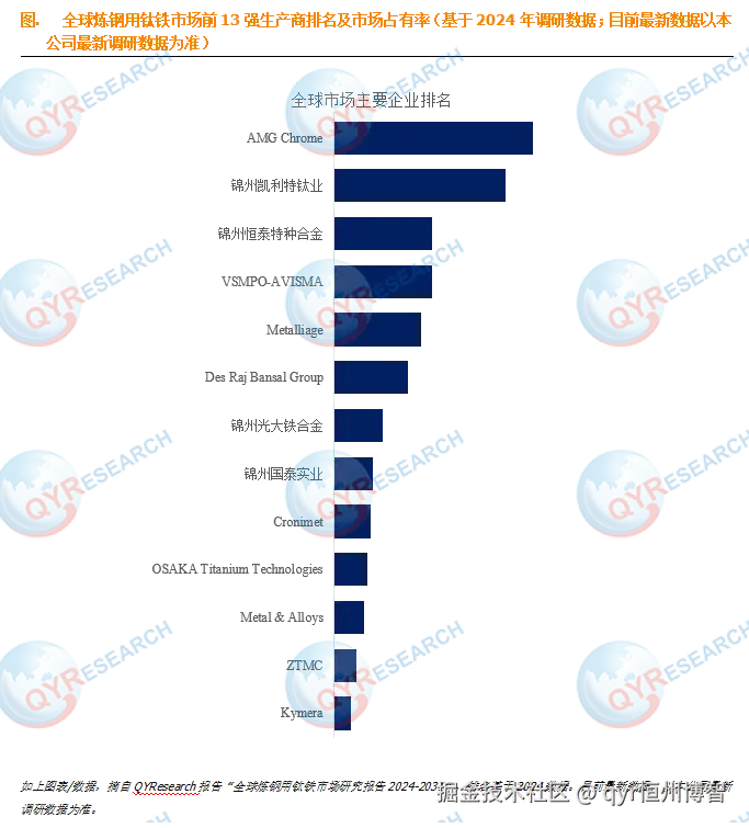 根据QYResearch头部企业研究中心调研,全球范围内炼钢用钛铁生产商主要包括AMG Chrome、锦州凯利特钛业、锦州恒泰特种合金、VSMPO-AVISMA、Metalliage、Des Raj Bansal Group、锦州光大铁合金、锦州国泰实业、Cronimet、OSAKA Titanium Technologies等。2024年,全球前五大厂商占有大约58.0%的市场份额。