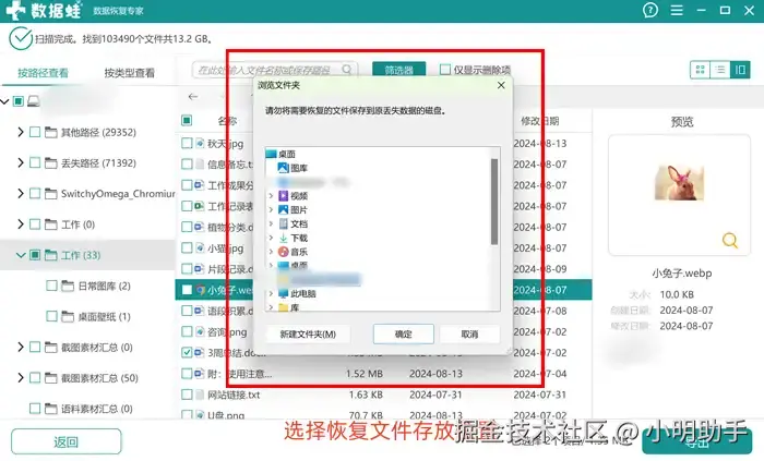 步骤3: 在弹窗中选择恢复文件的存放位置,切记不用放回文件丢失的原位置哦。
