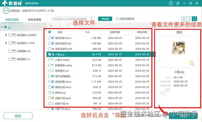步骤2: 扫描出来的文件中,我们可以根据扫描出来的文件信息选择出目标文件;选好后点击“导出”按钮;