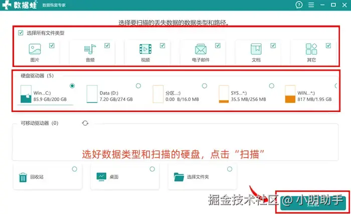步骤1: 进入到软件首页后,我们根据丢失的文件,选择好数据类型和扫描位置,之后点击按,开始扫描工作;