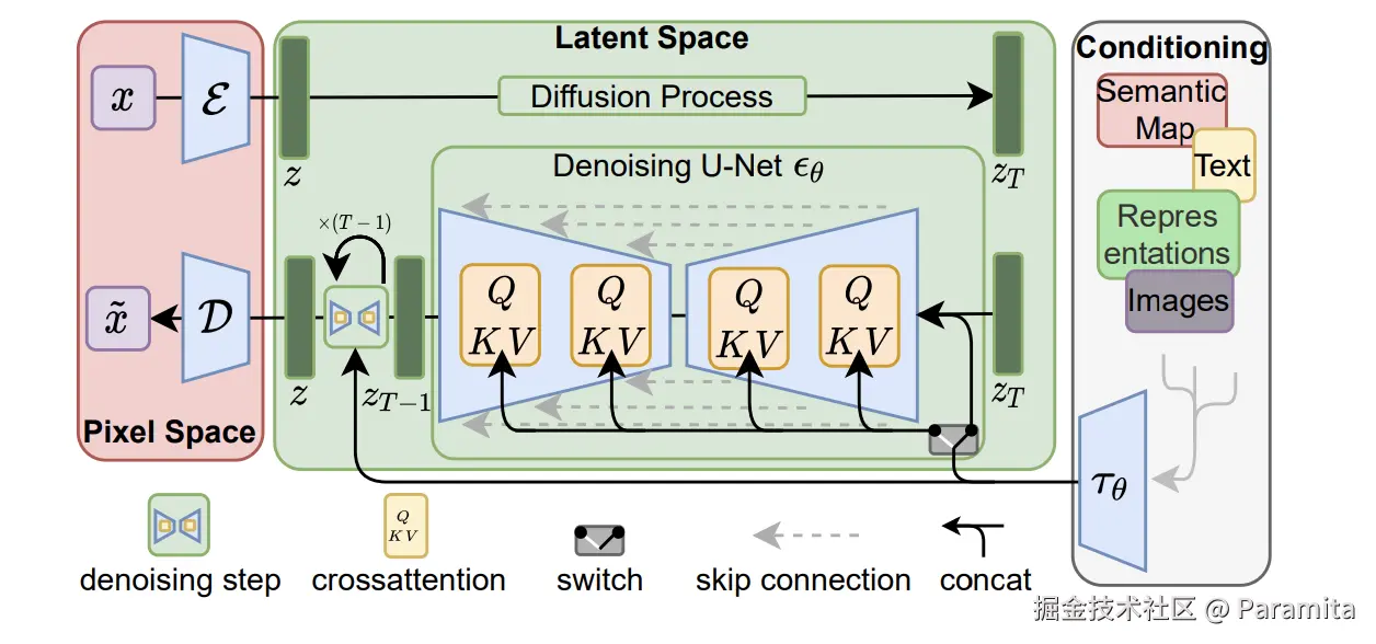 - 其中,在 U-Net 网络的瓶颈层和上采样层都引入了交叉注意力机制(Cross-Attention), 将条件特征(如文本编码)的 K/V 与图像特征的 Q 进行交互,实现“以文导图”的条件信息指导去噪生成过程。