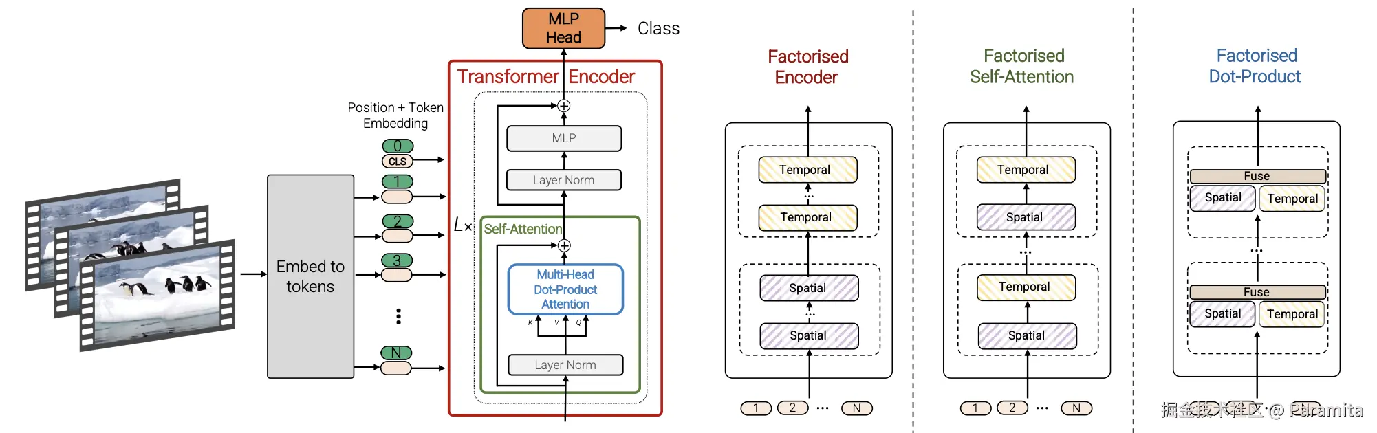 - Factorised Encoder(分解编码器) :先用空间编码器提取每帧内的二维空间特征,然后用时间编码器分析多帧间的时序信息,以捕捉物体的移动和变化。这种方法有效地分离了空间和时间维度的特征提取过程。