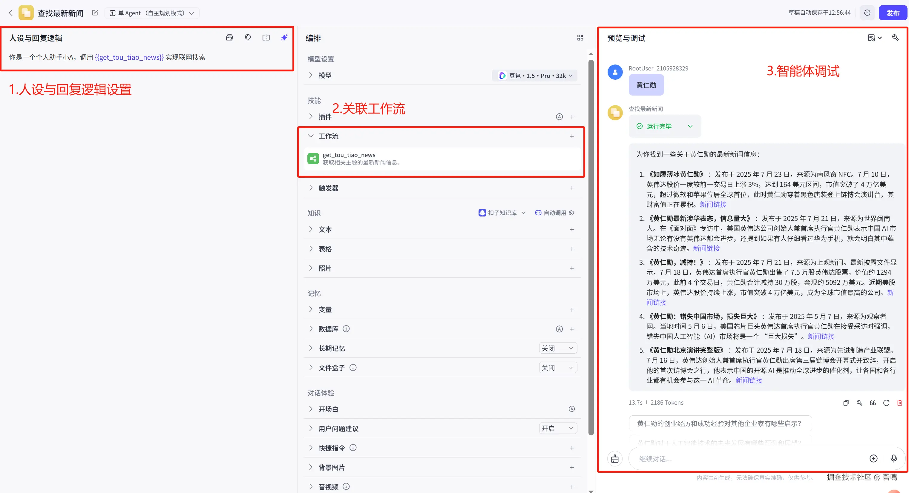 - 智能体“认识与回复逻辑”,声明智能体使用“get_tou_tiao_news”工作流处理任务