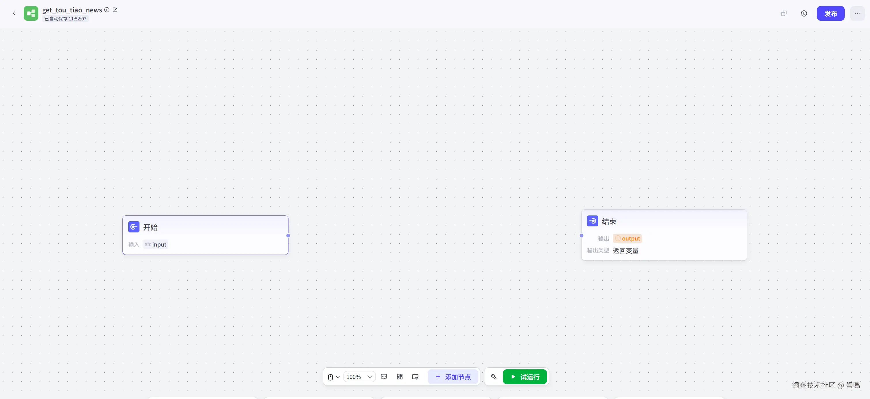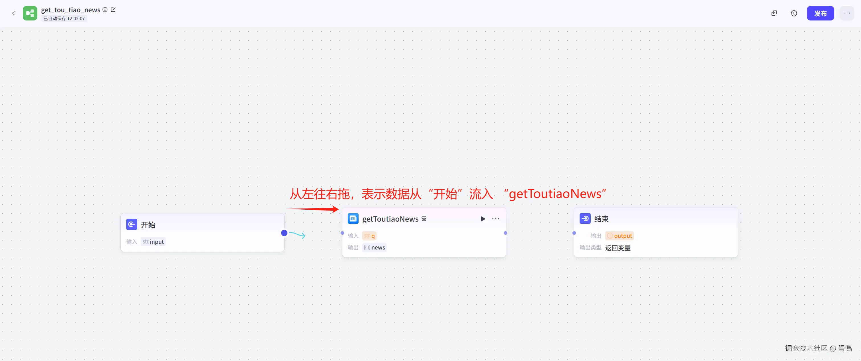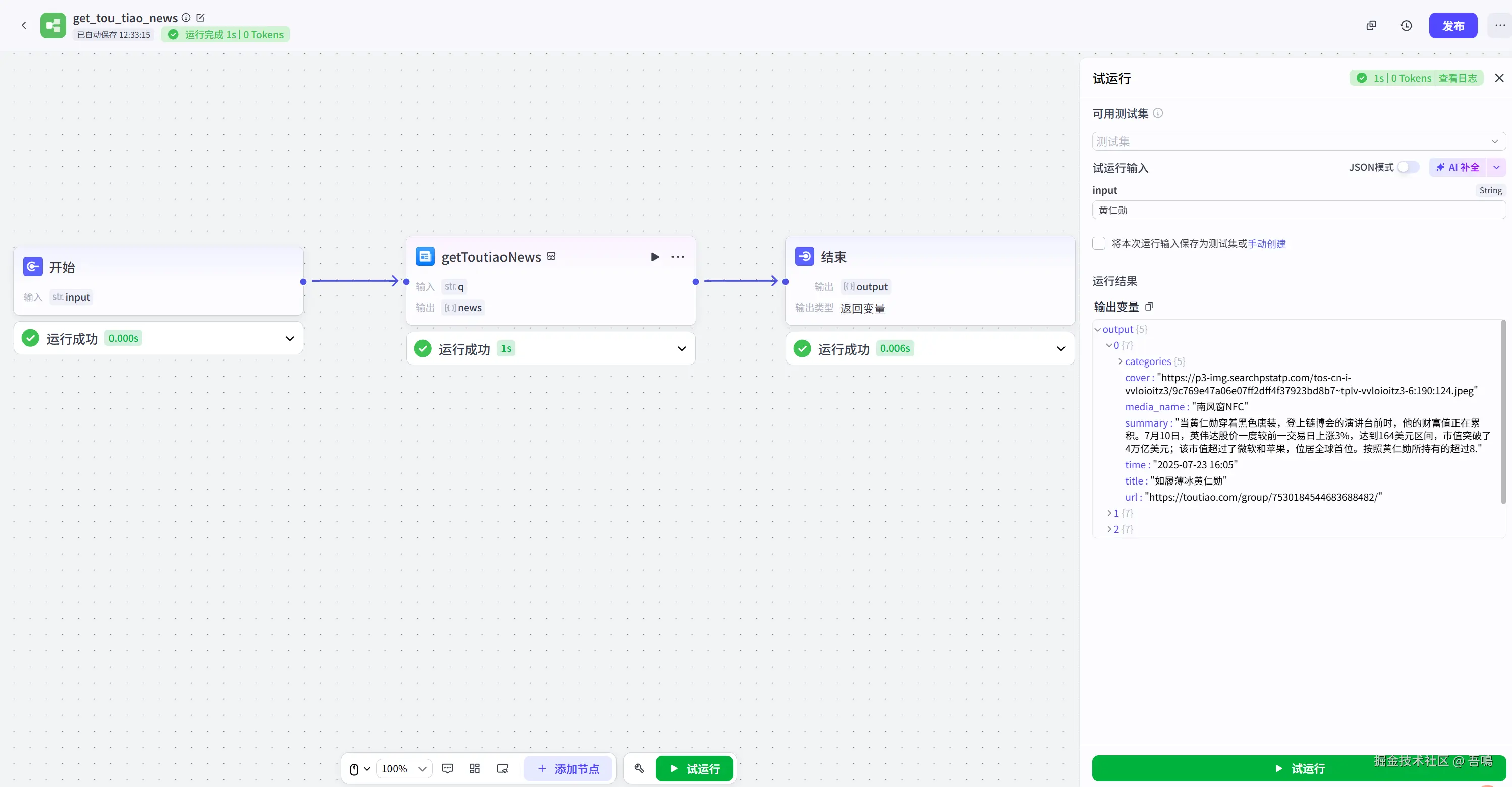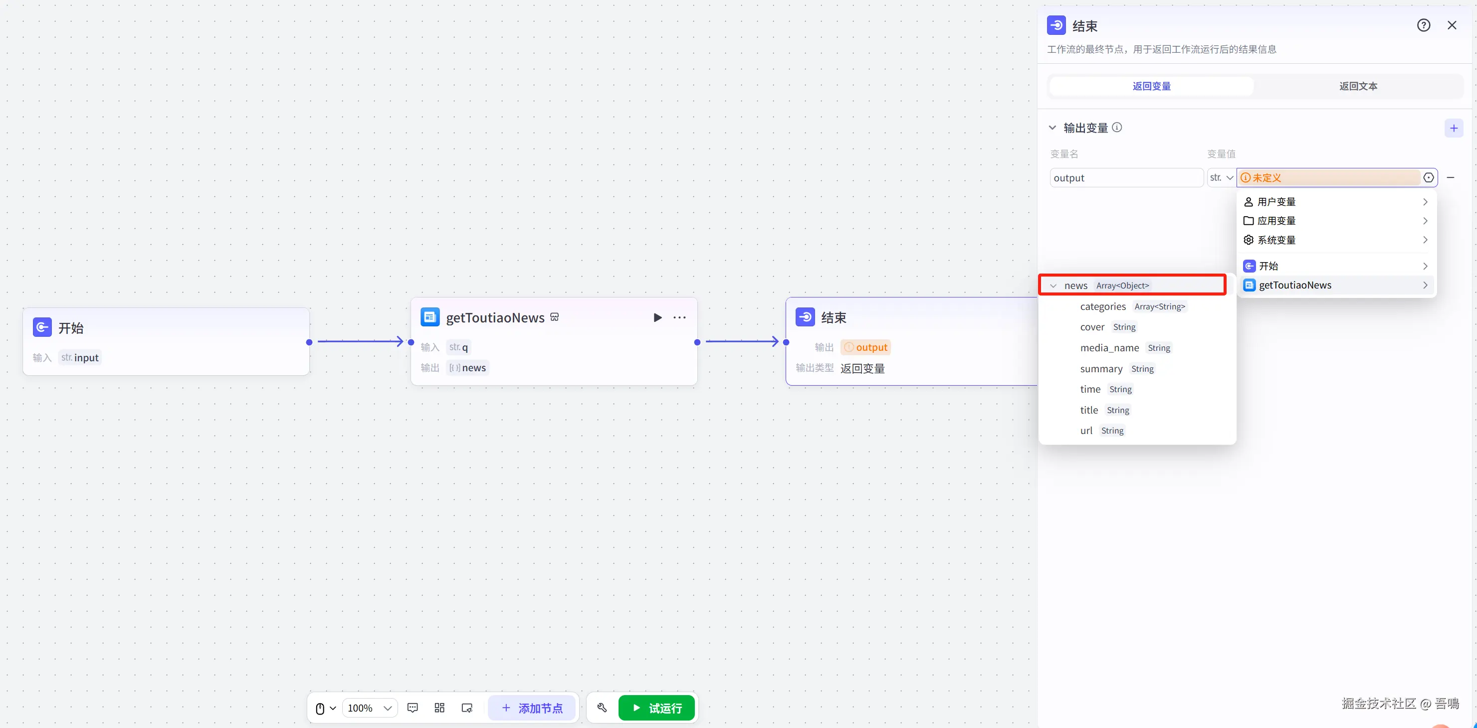 - “getToutiaoNews”节点与“结束”节点连线