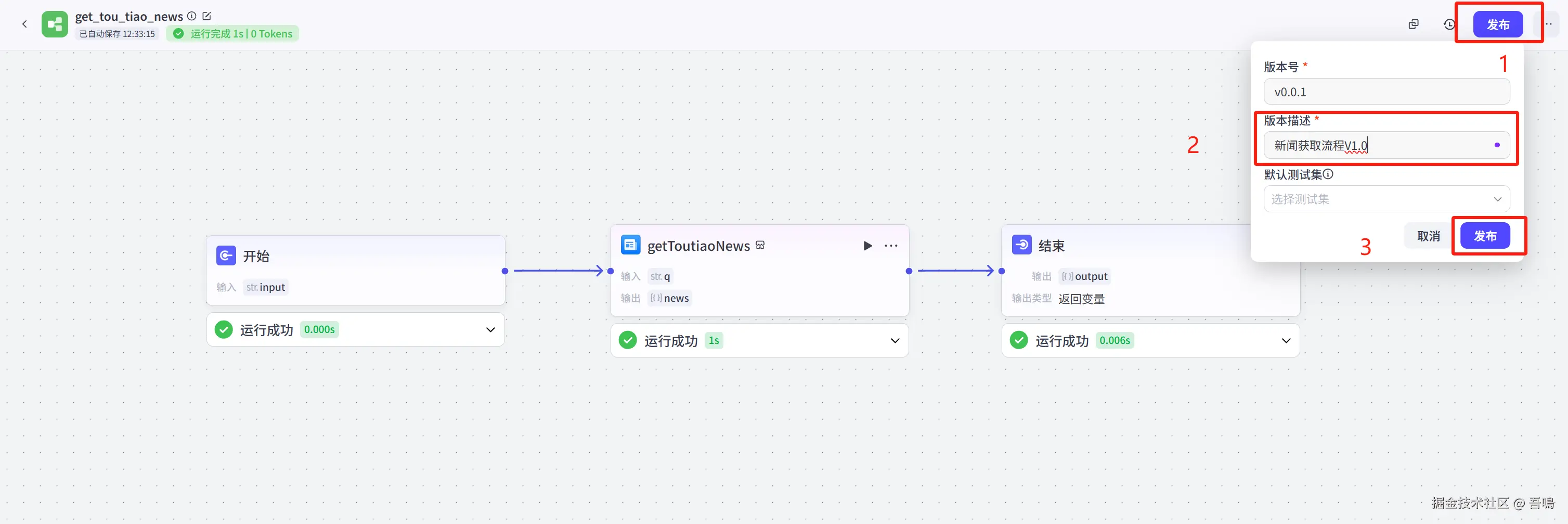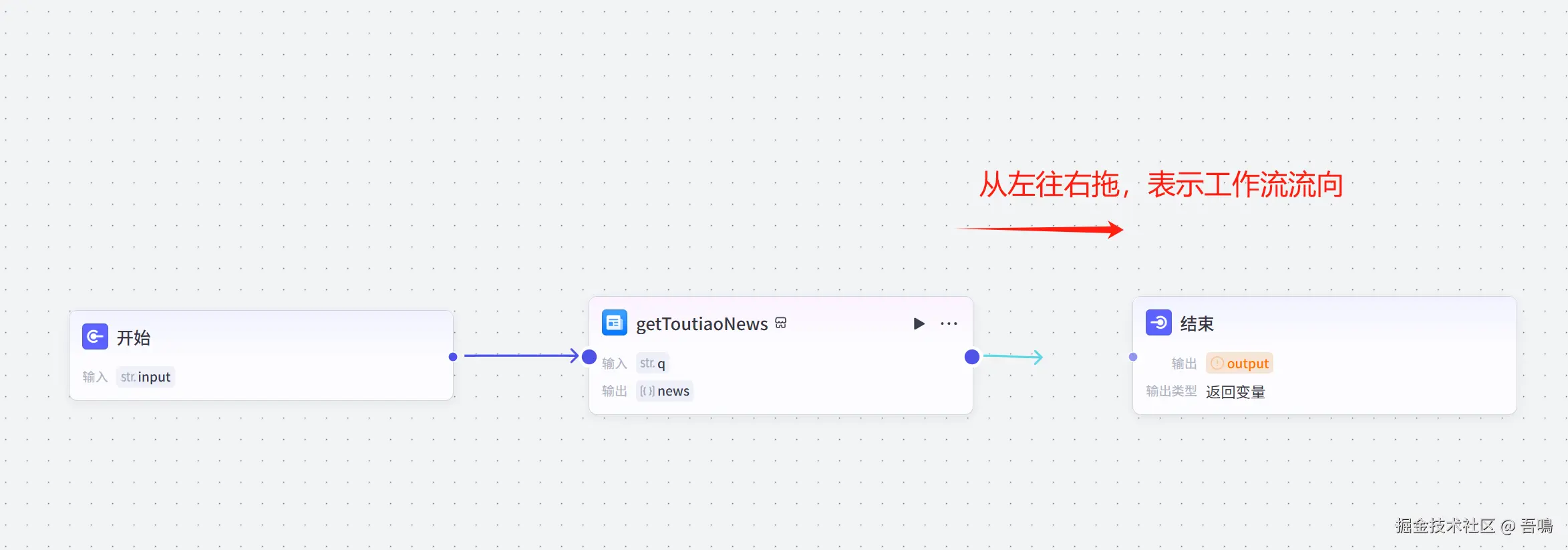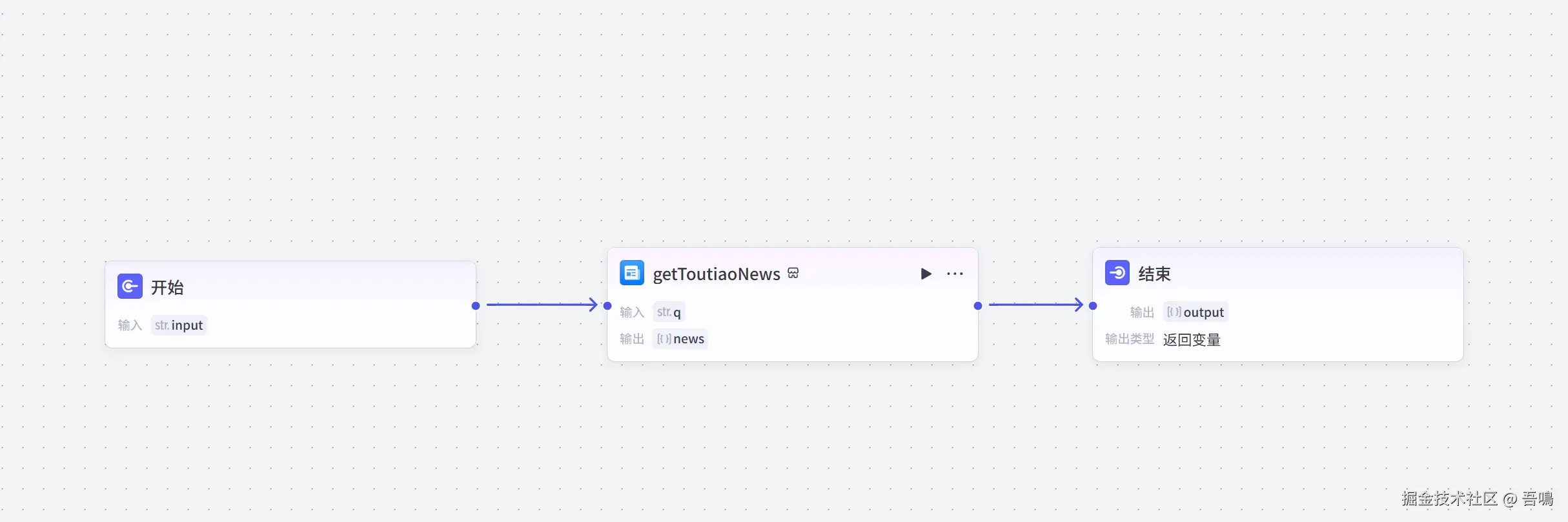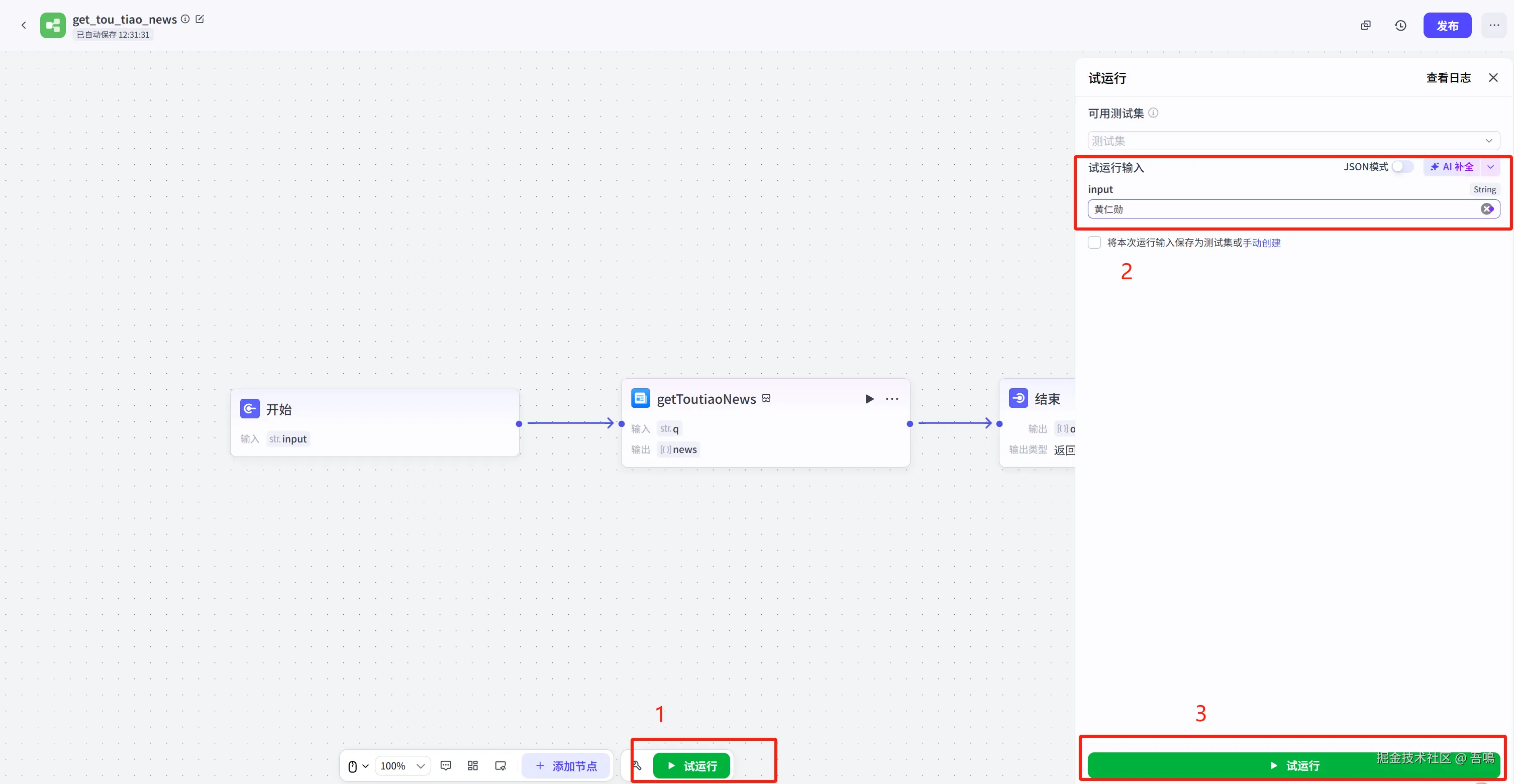 - “getToutiaoNews”节点与“结束”节点连线