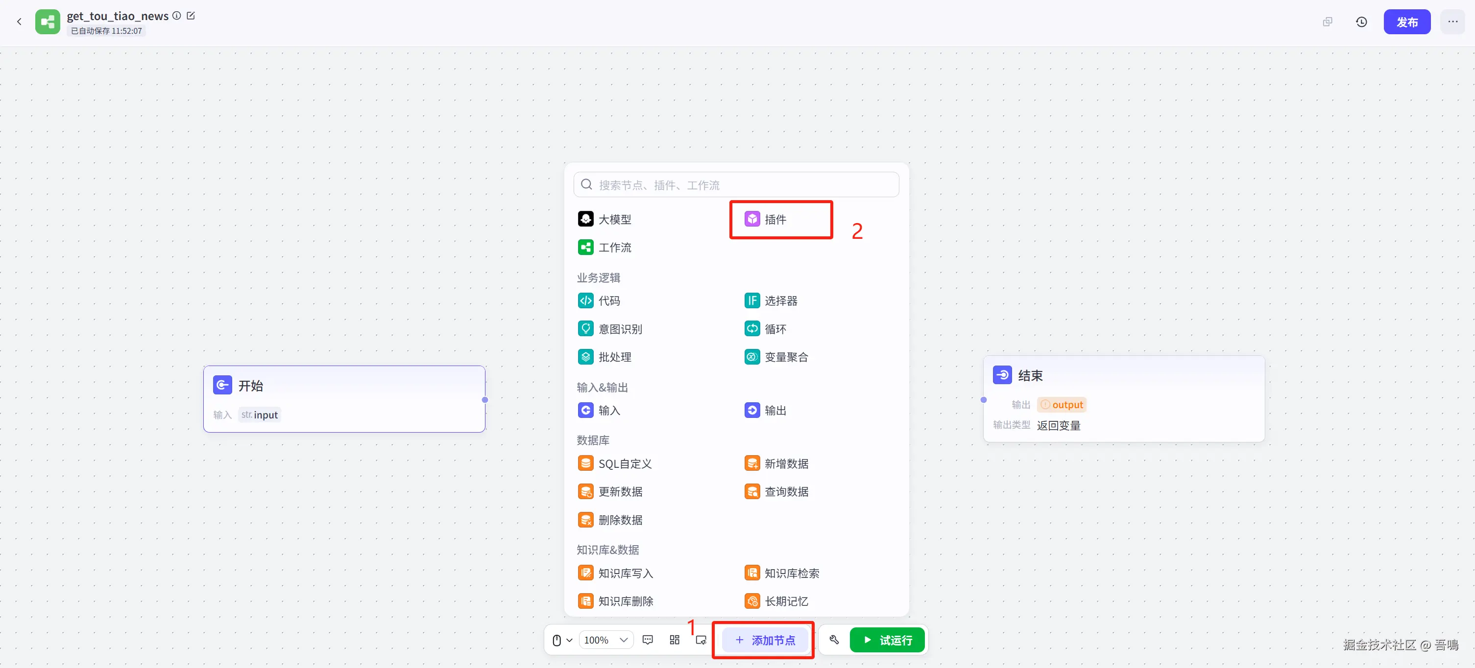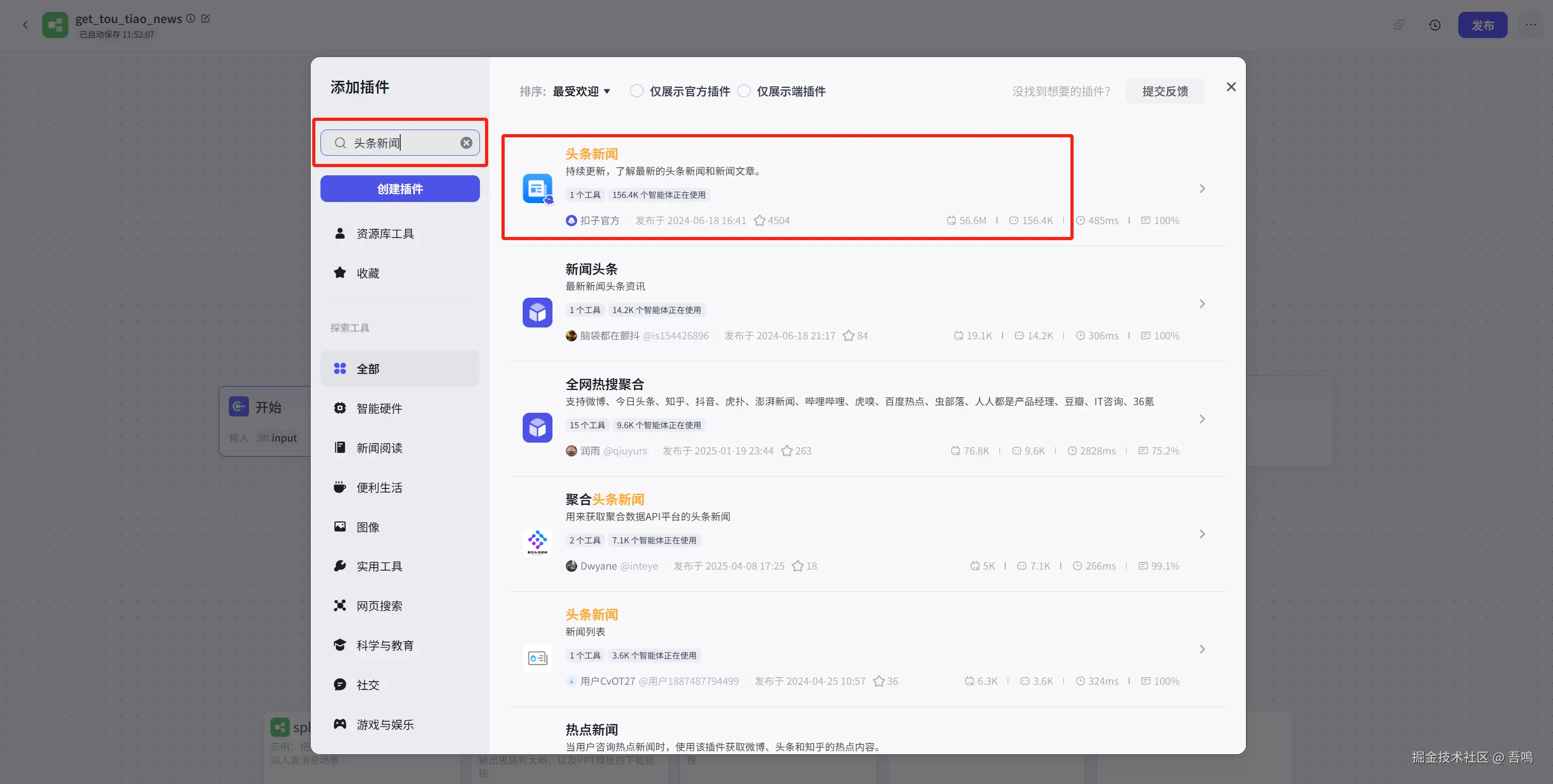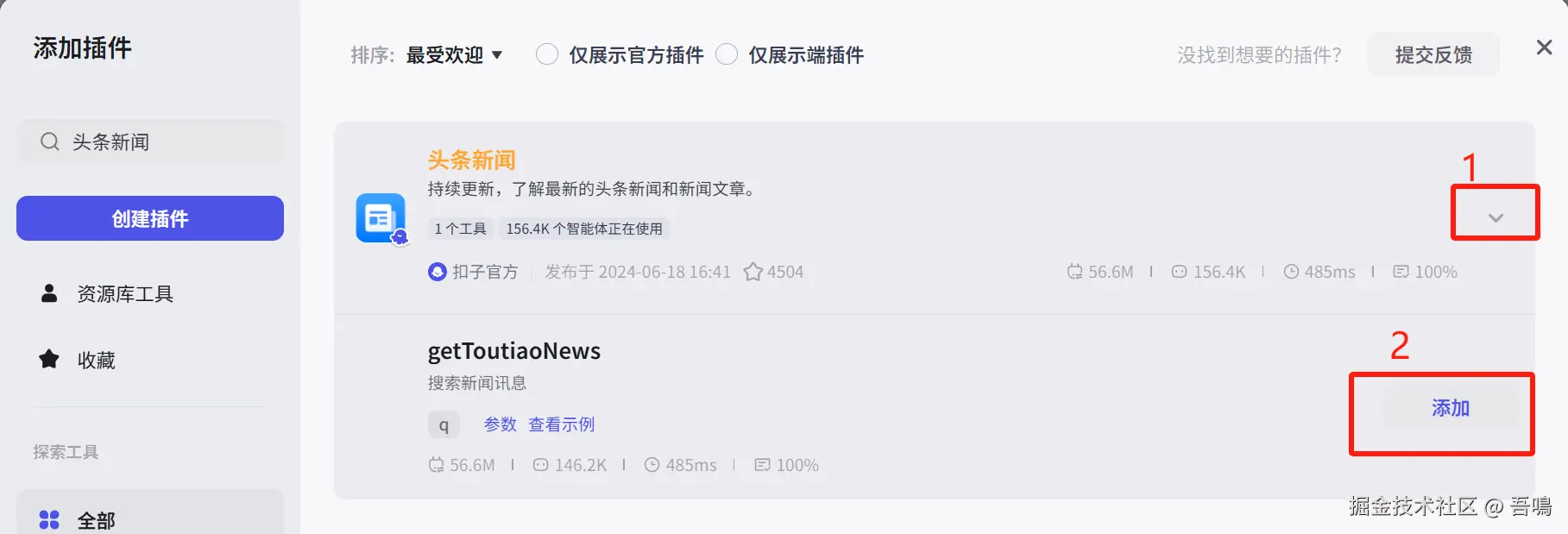 - 点击“头条新闻”插件,选择添加“getToutiaoNews”工具
