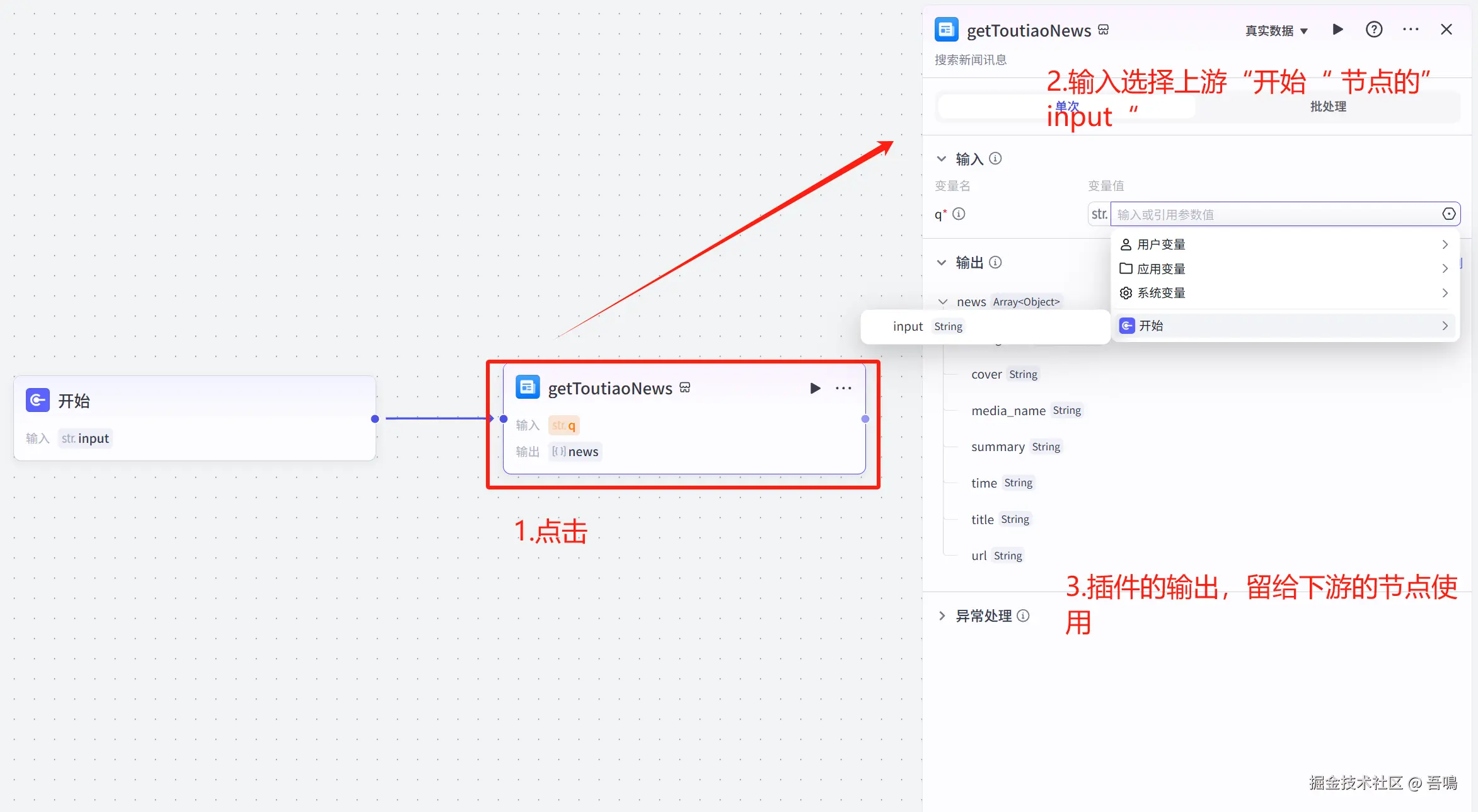 - “getToutiaoNews”节点与“开始”节点连线