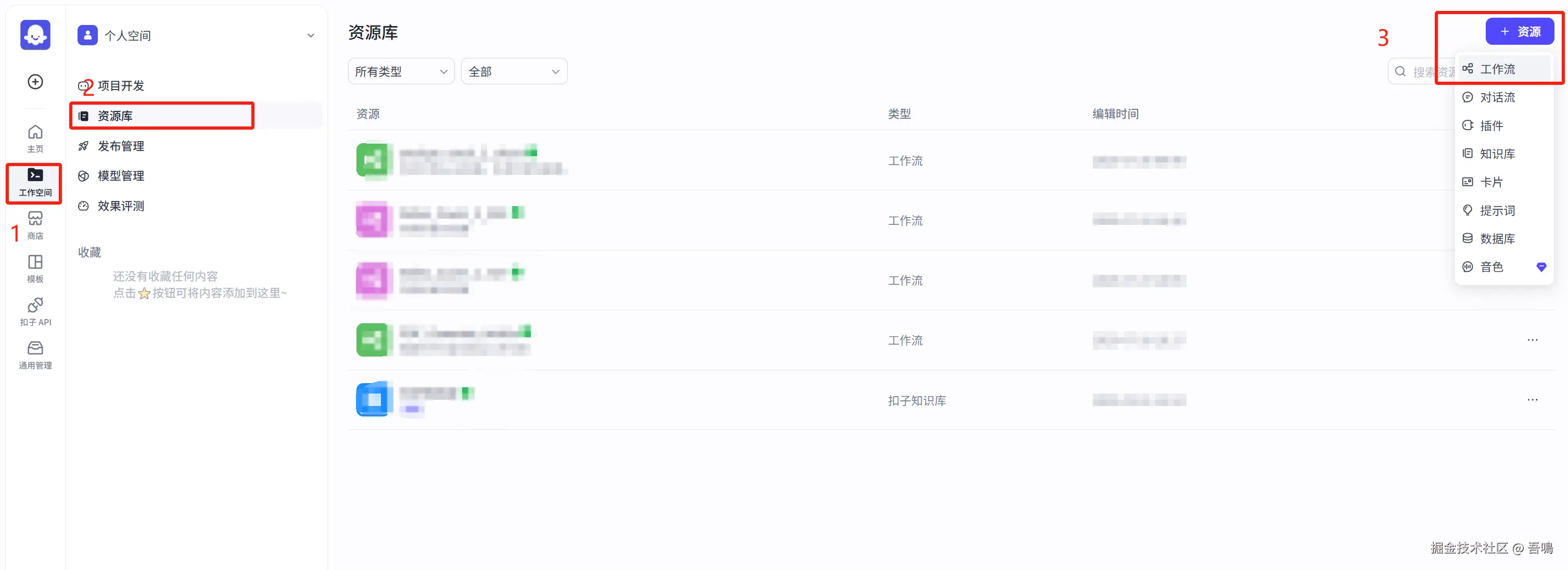 - 左侧菜单栏,工作空间 -> 资源库